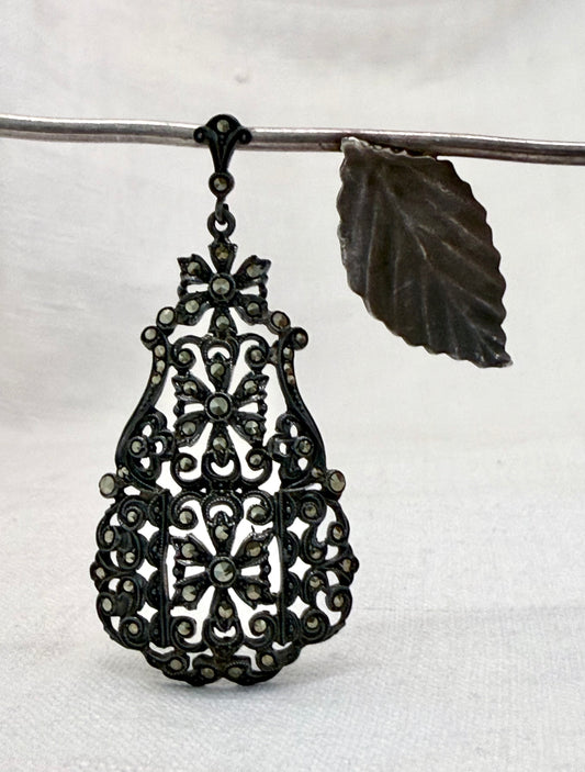 .935 1910s Art Nouveau German Jugendstil Edwardian era high grade silver and marcasite floral drop pendant