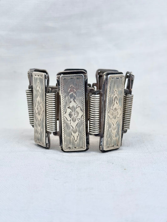 .1880s .1890s .925 Aesthetic Victorian era wide link and solid silver etched panel bracelet