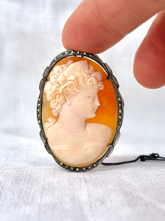 .1930s 1940s .800 silver cameo hand carved exceptional vintage romantic cameo dame shell silver marcasite brooch
