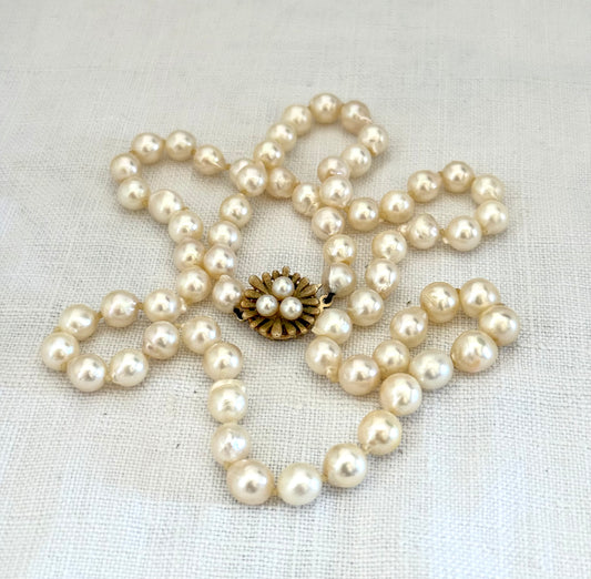 .1950s .375 .9ct heirloom gold clasp and luscious pearlescent pearl string necklace