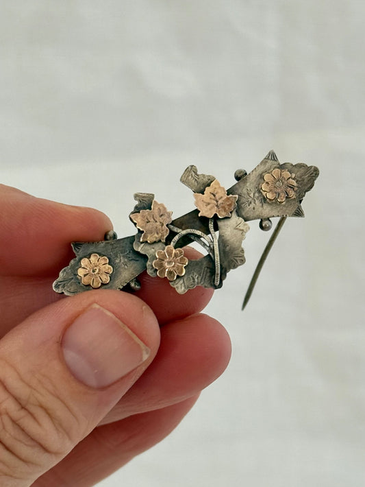 .1901 .925 antique rose gold and fine hallmark silver sweetheart token horseshoe and floral keepsake token brooch
