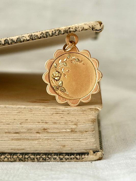 .18ct .1900s antique French Eagle head 18ct yellow gold green gold romantic scallop border Rose decal pendant