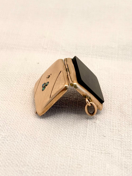 .1890s .1900s antique Victorian to Edwardian exquisite Rose Gold Cased photo locket with Opals and Pearl flower decal and Onyx gemstone back