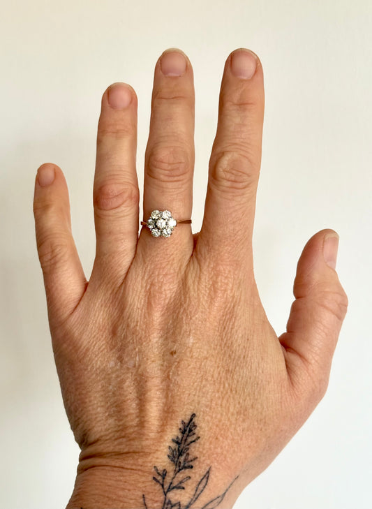 .18ct .1900s 1.00ct round brilliant antique floral cluster rosette high carat 750 yellow and white gold ring