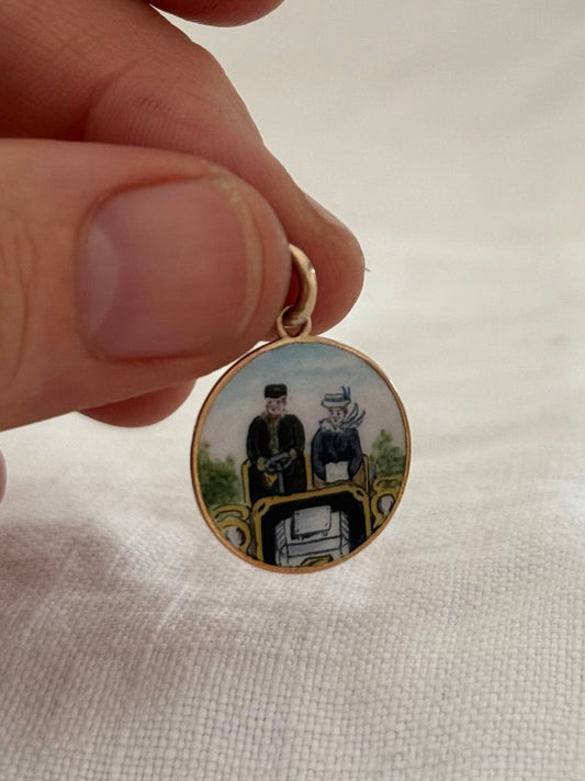 .1900s .375 .9ct gold enamel afternoon drive car drive quirky scene finely painted enamel on gold pendant