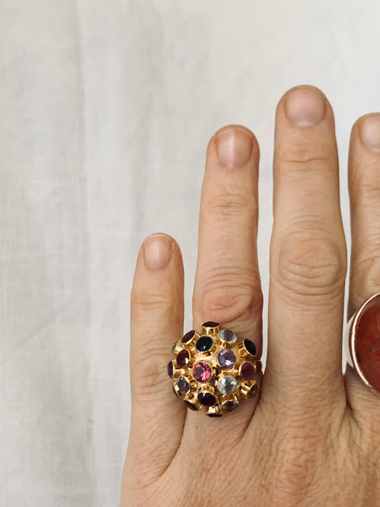 .18ct .1950s gloriuous Mid Century Modern yellow gold Sputnik gemstone studded designer studio made domed round ball 19 colourful multi gemstone cocktail ring