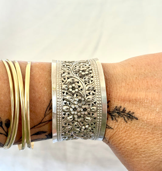 .1990s .925 artisan made solid silver floral embossed repousse wide and glorious flower sterling silver open cuff bangle