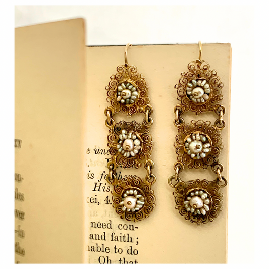 .1800s .1820s early rare Collectors find Early Georgian era Sicilian Italian antique gold and pearl highly sought after fine high carat gold filigree dangle estate find earrings.