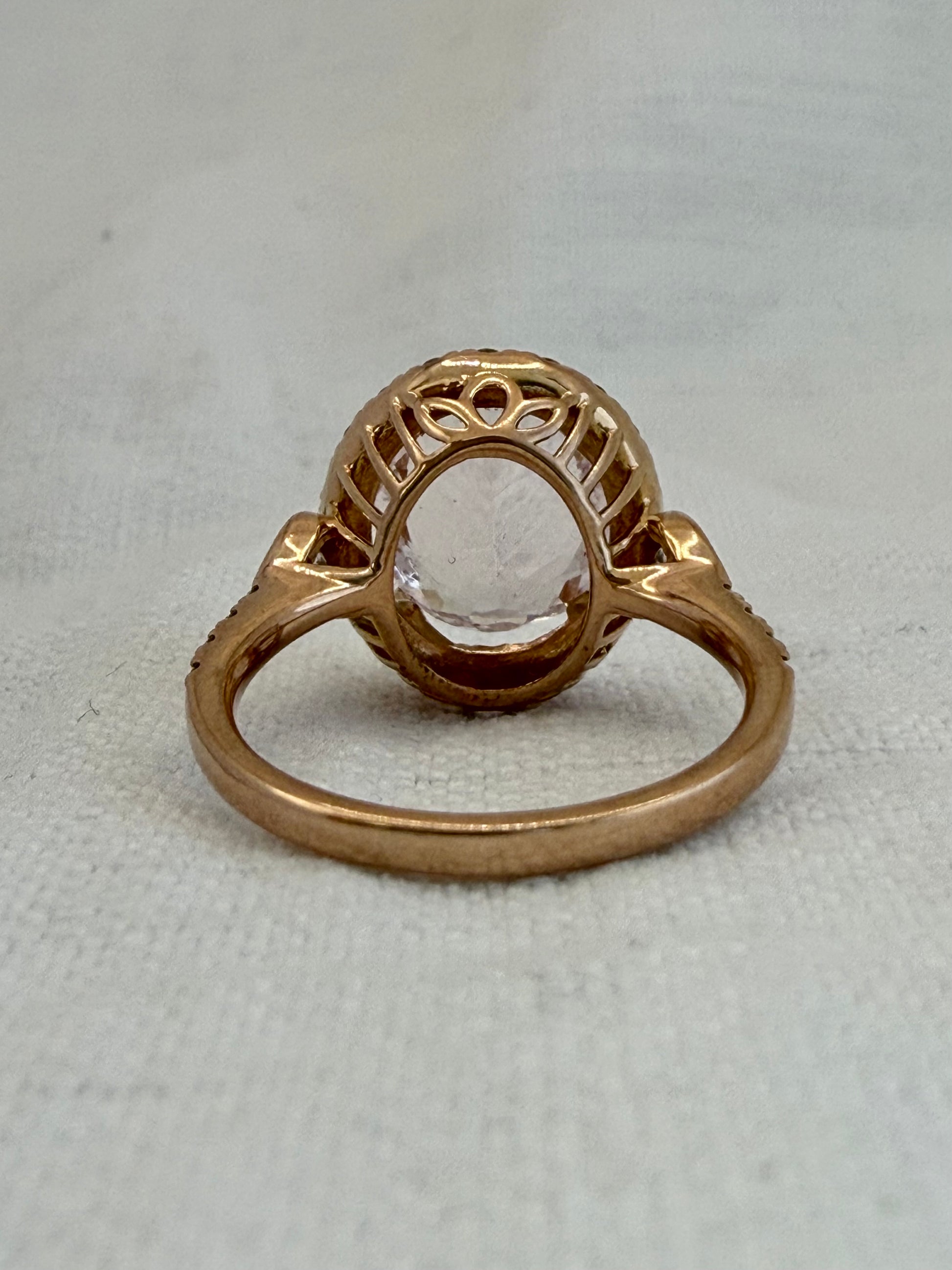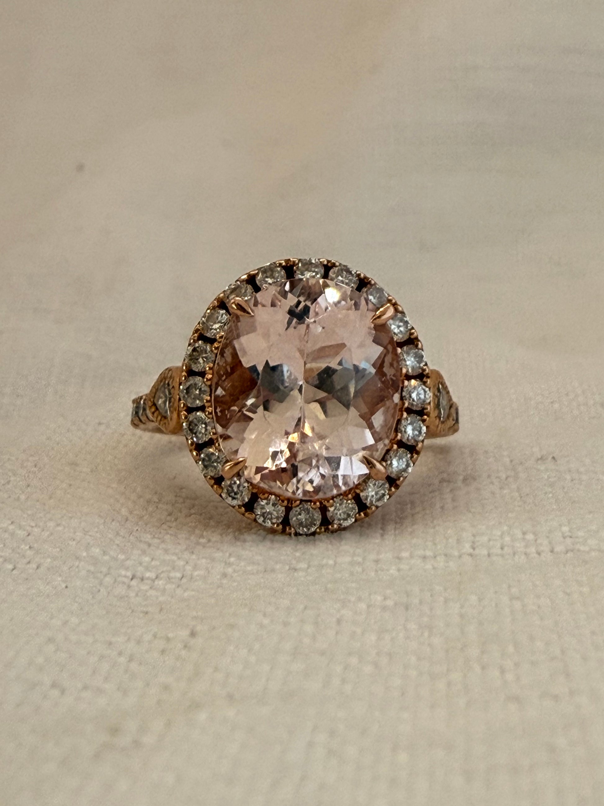 In this beautiful and eye-catching rose gold ring, the magnificent and large and beautiful oval pink tone Morganite gemstone sits framed in a halo of 20 natural round brilliant diamonds.