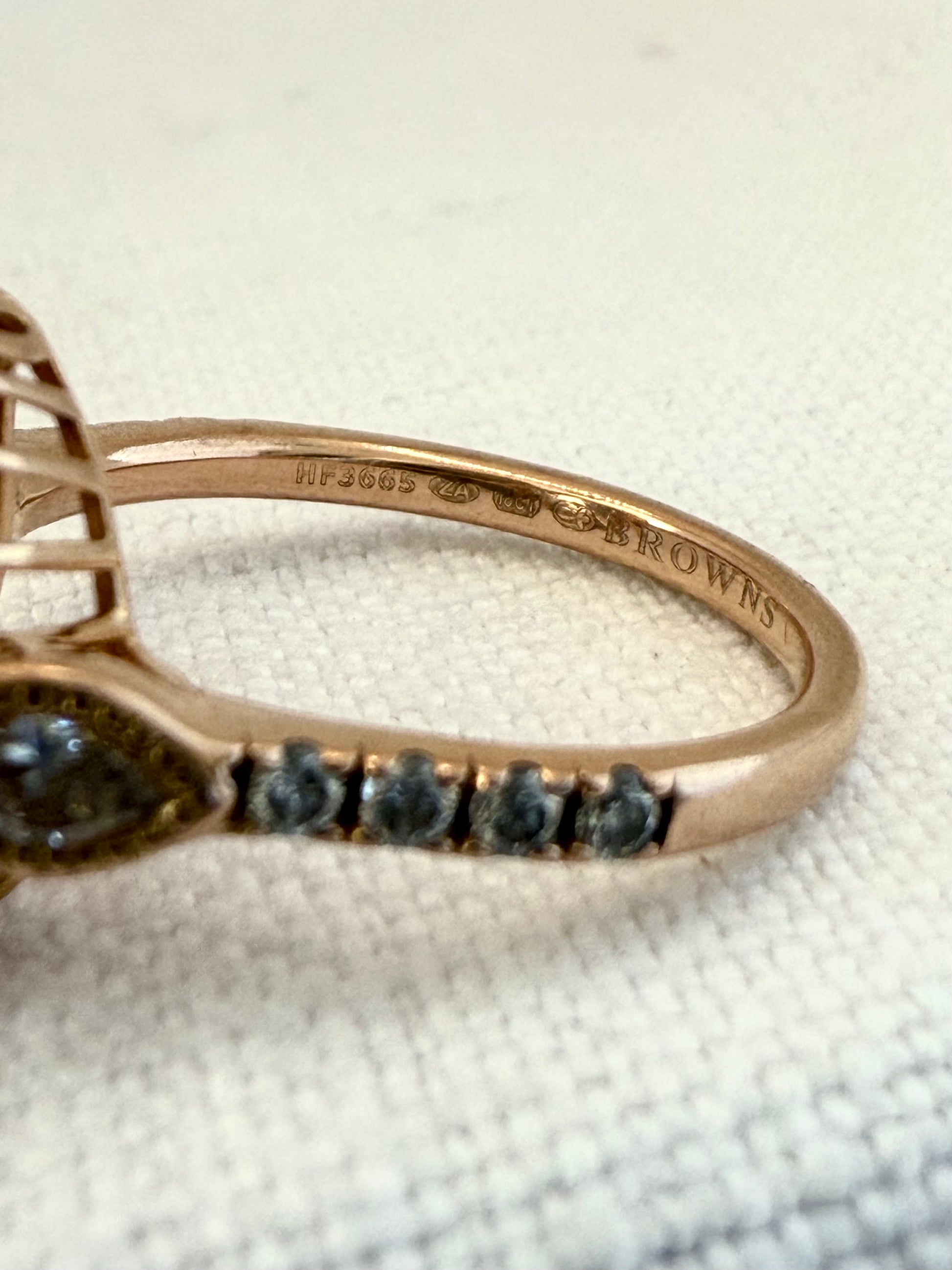 A much desired, luxurious and striking 18ct rose gold gemstone ring by the famed Browns, the Diamond Store.