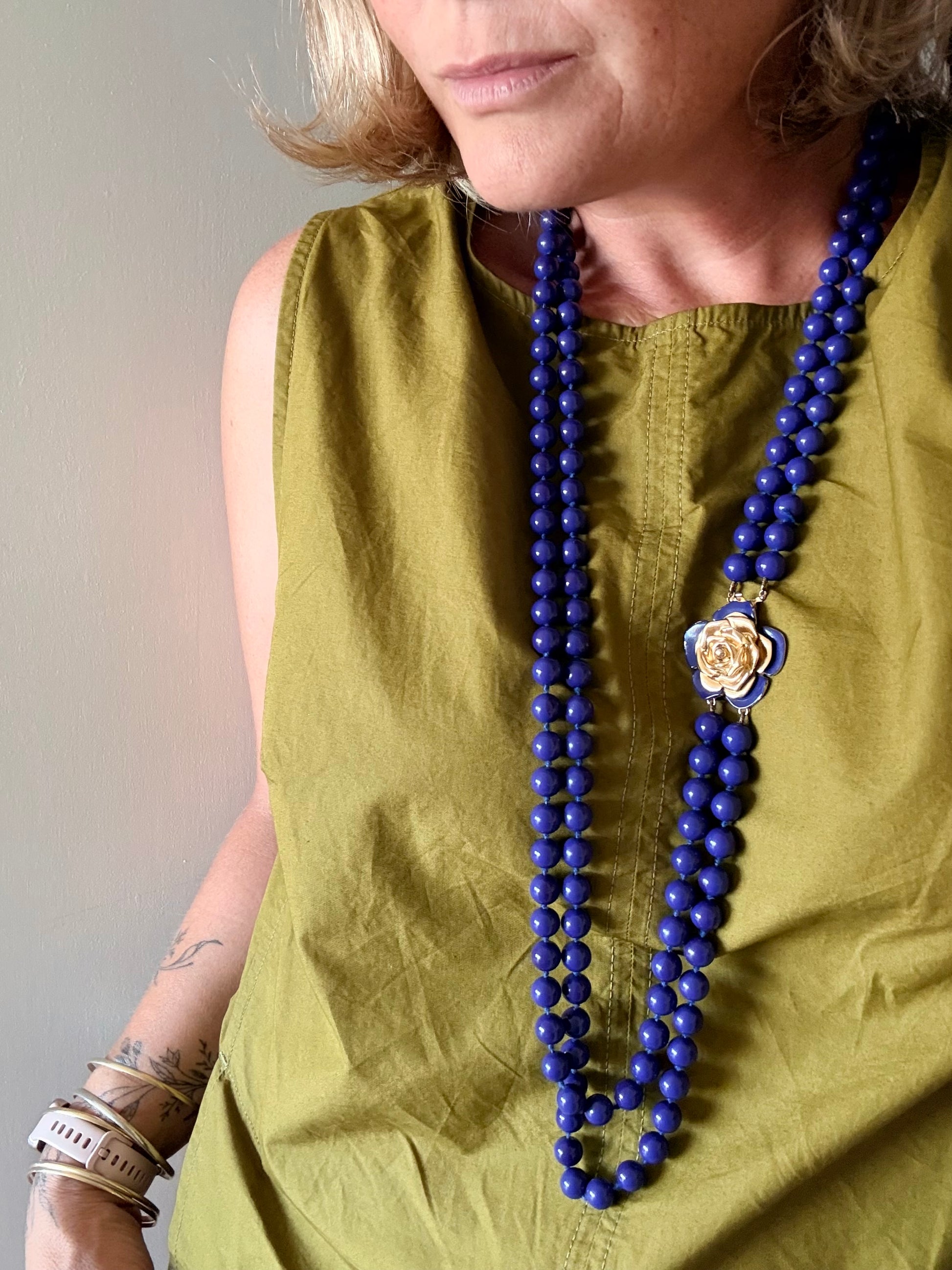 Rare and magnificent YVES SAINT LAURENT era 1980s vintage double strand long Lapis blue Royal blue costume bead necklace tied off with the perfect gold tone and blue enamel Rose Flower slider clasp accent.