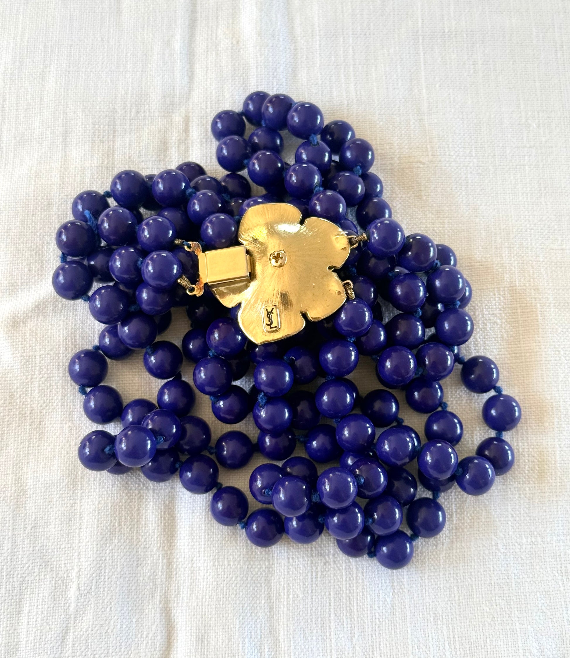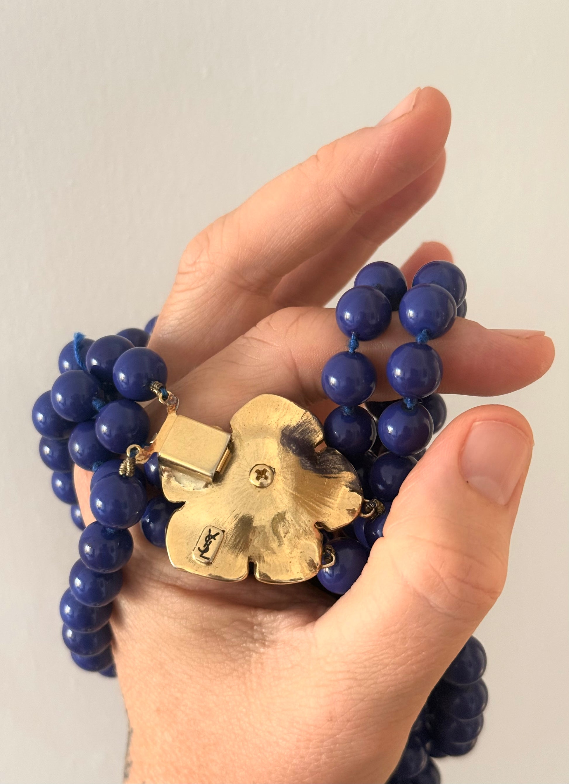.100cm long .1980s Rare Yves Saint Laurent designer double long strand Lapis Blue Royal Blue Rose Flower gold tone floral clasp costume accent necklace