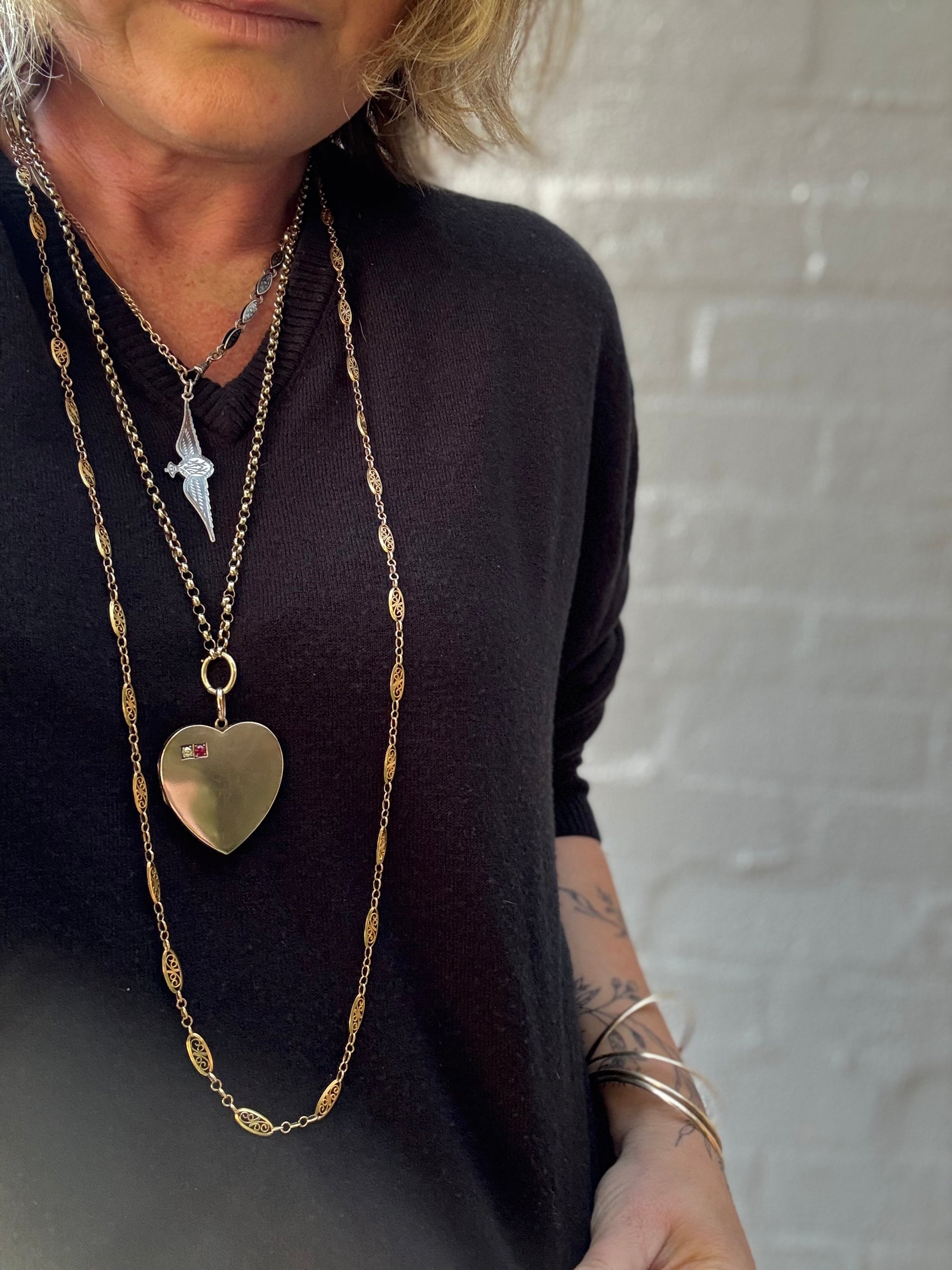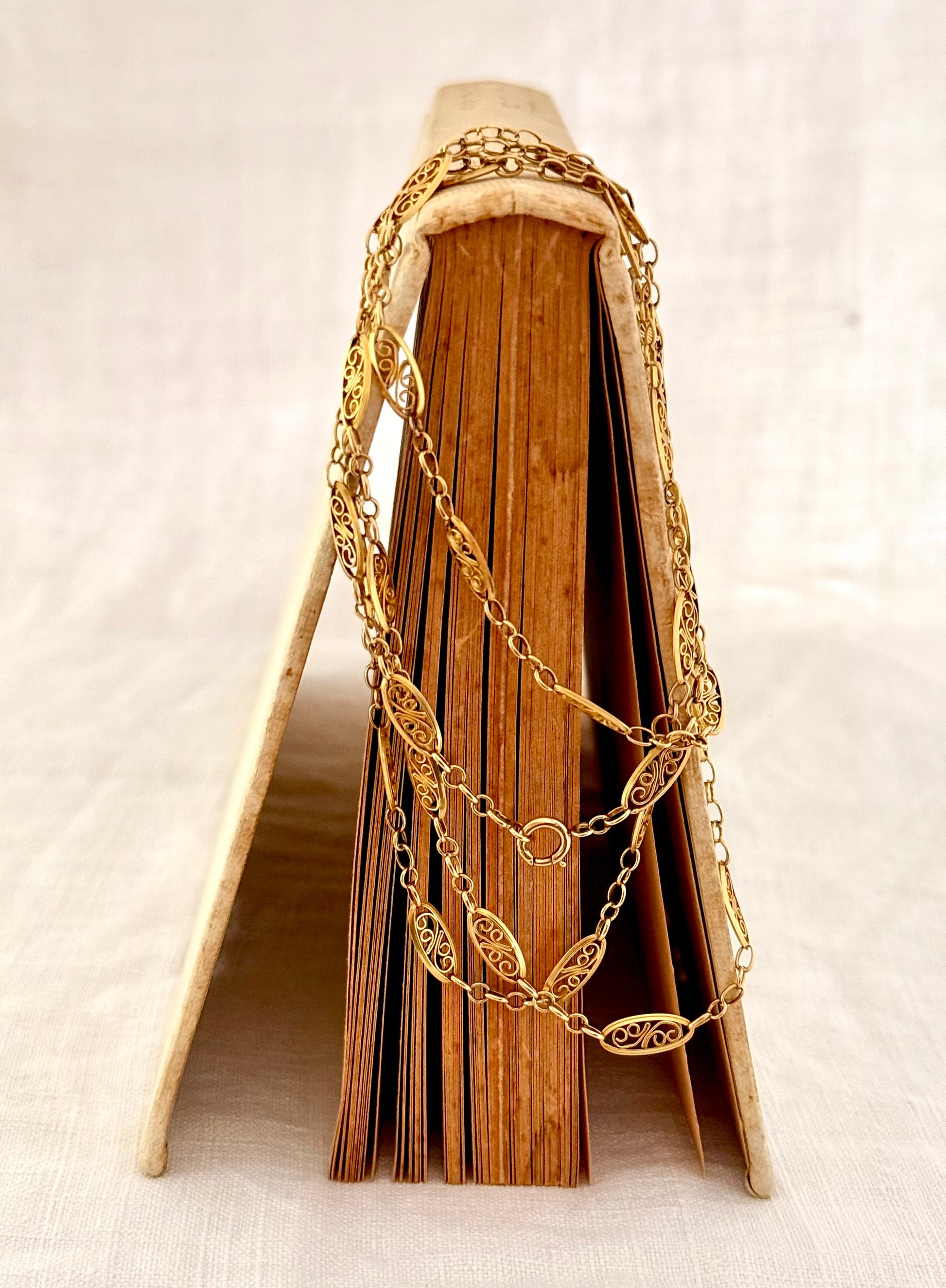 The fancy scroll links are each 5.2mm wide and are linked by smaller slim oval chain links, allowing flow and flexibility to the long chain necklace. This period necklaces were worn long, fluidly hanging over gowns and layered with other elaborate choker and negligee jewels.