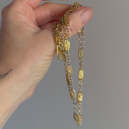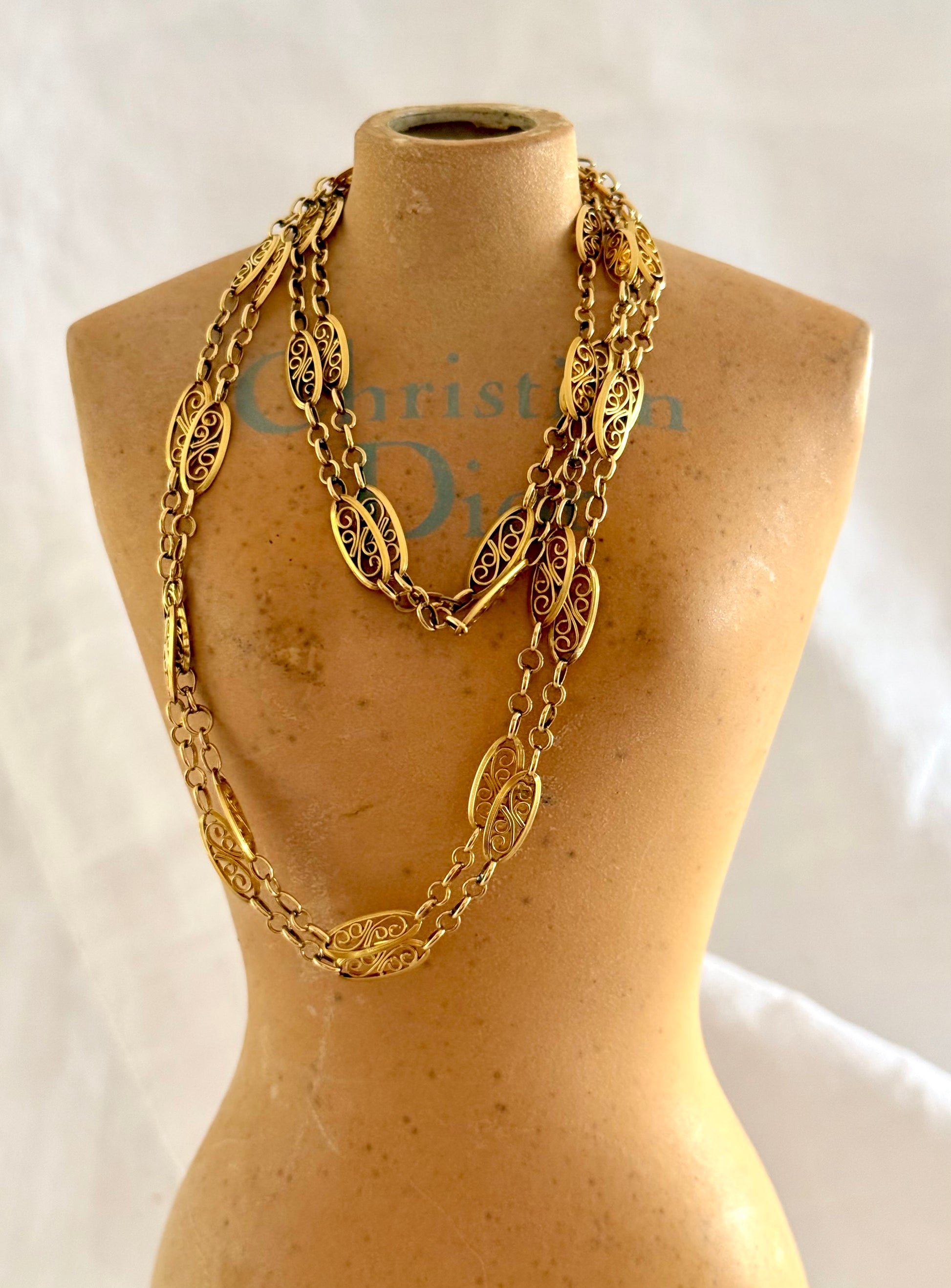 This elegant and ornate antique French gold chain necklace is an exceptionally beautiful 18ct yellow gold fancy openwork scroll form naïveté link chain that is long and beautiful.