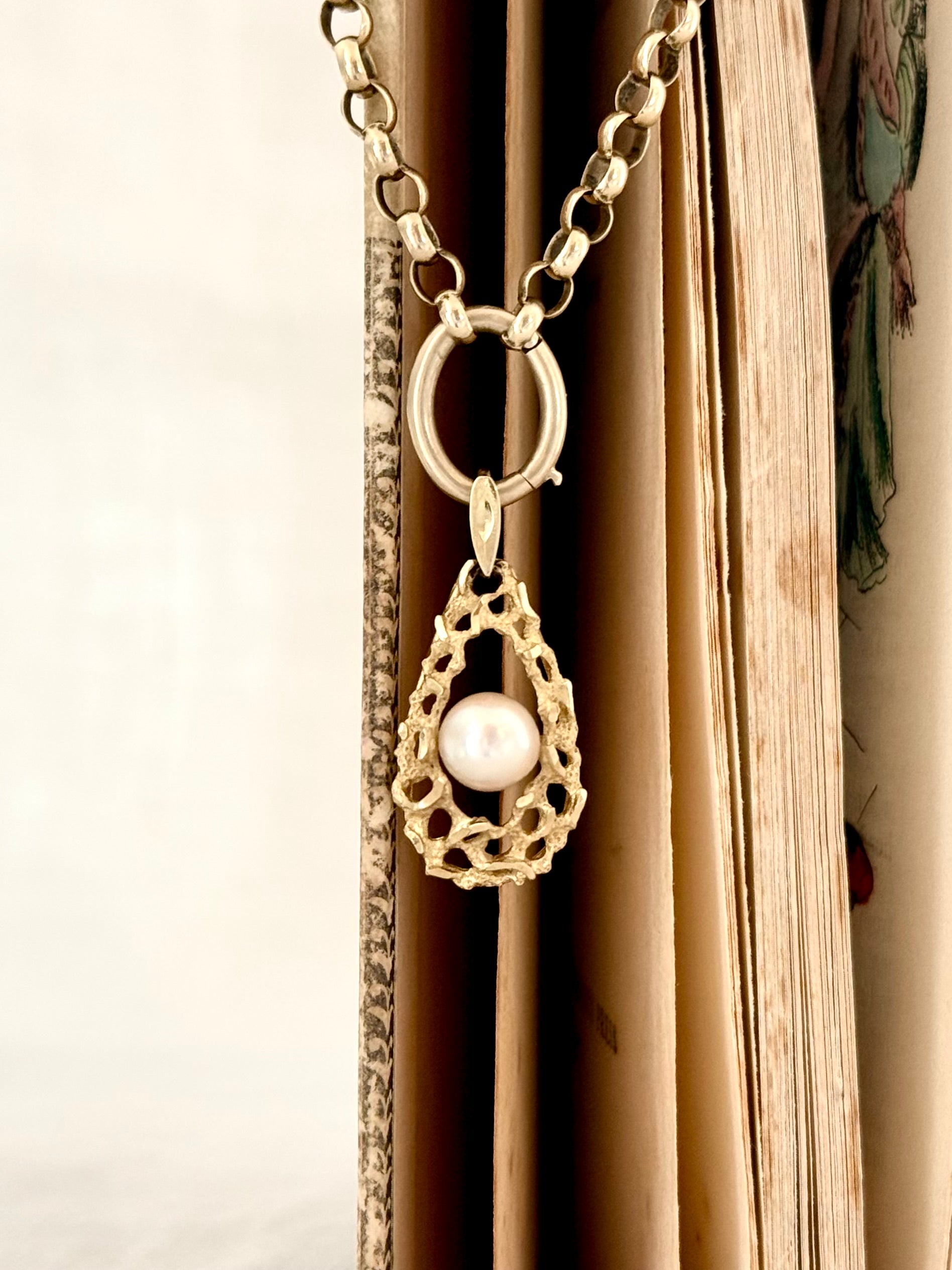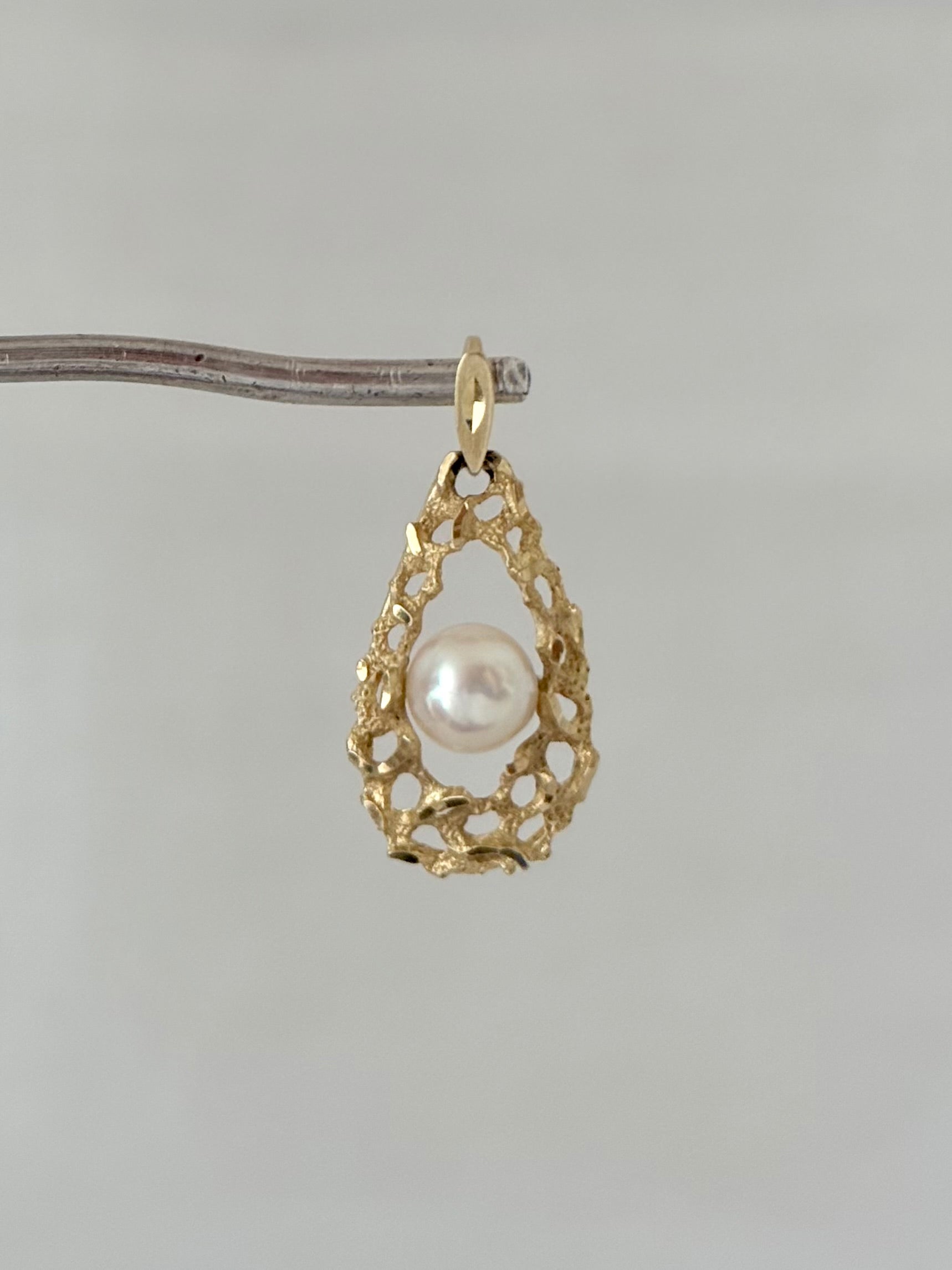 The 10ct gold teardrop pendant nestles a perfect champagne coloured pearl in its centre.