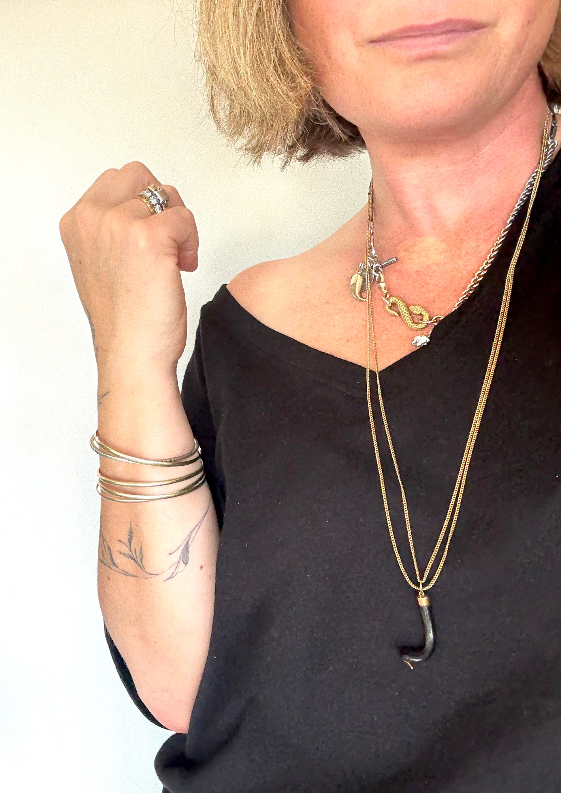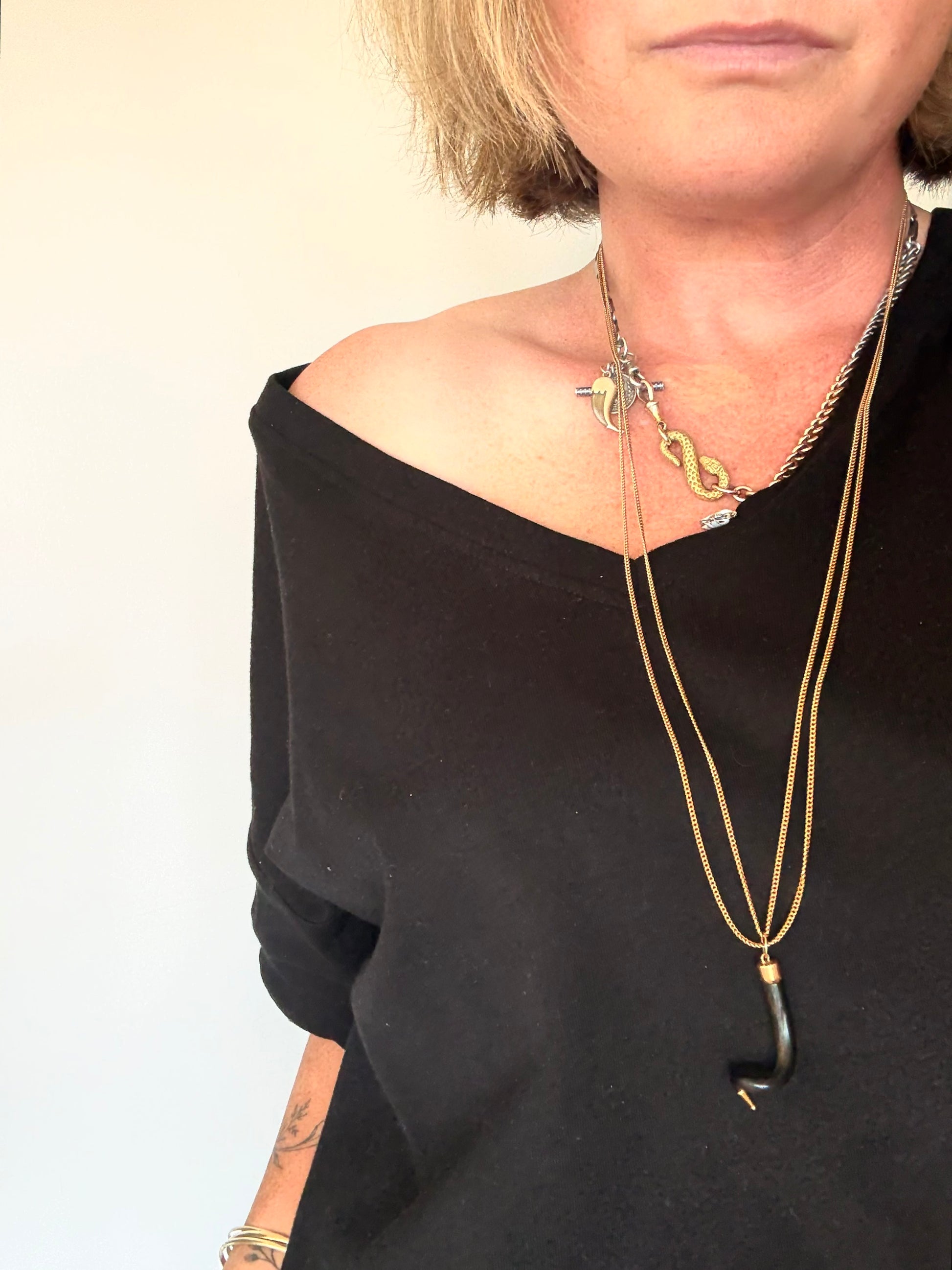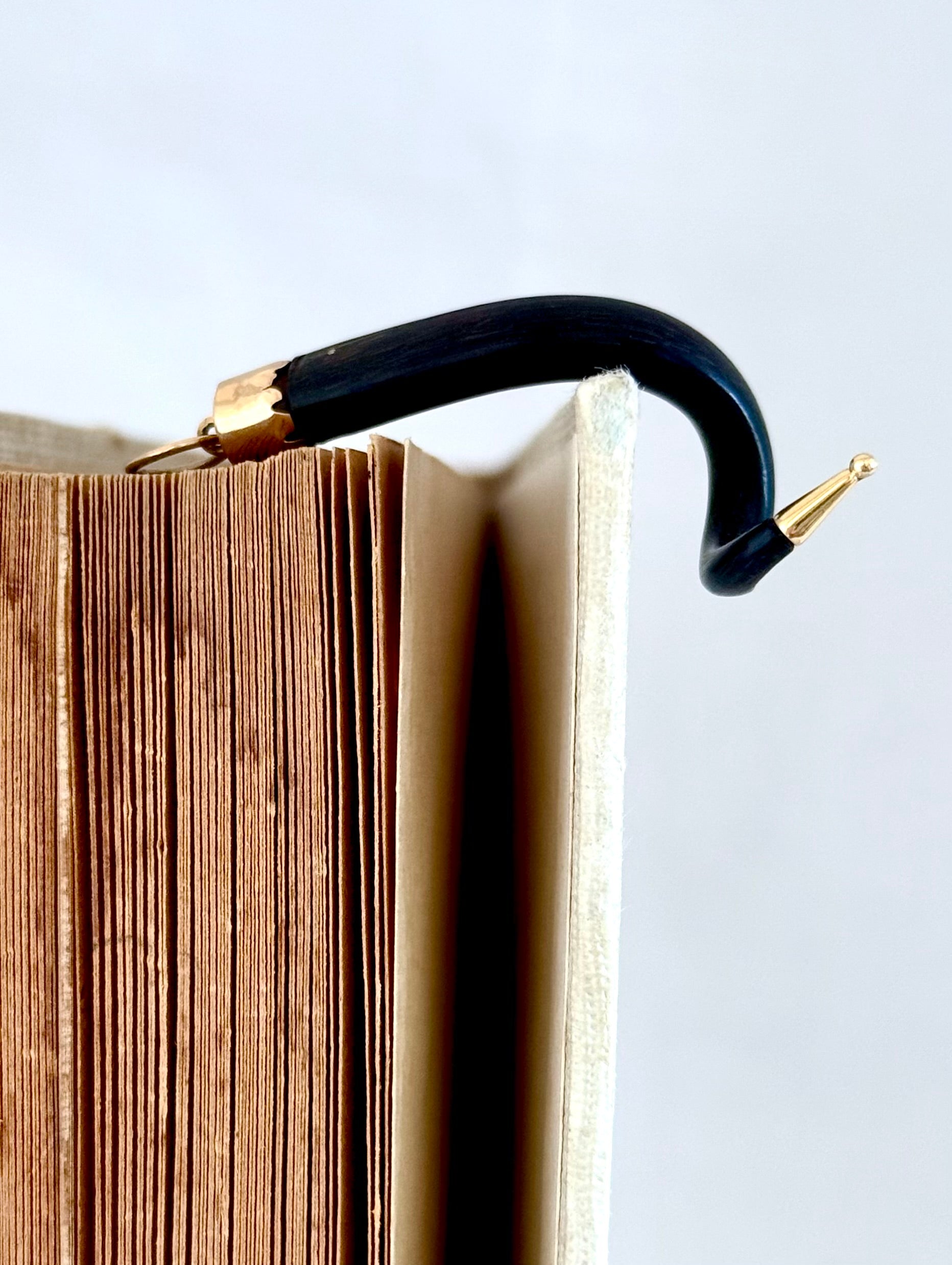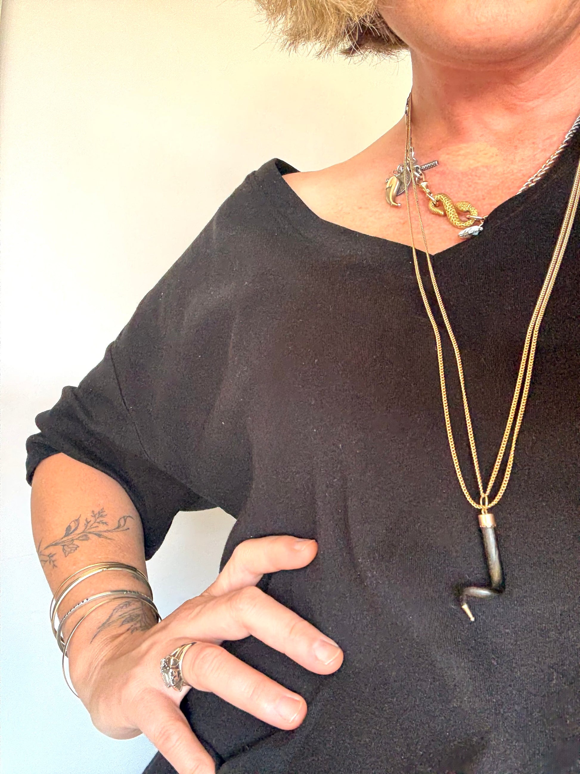 The black good luck horn charm is elegantly fitted with rich 14ct gold cap fittings, allowing the contrast between the deep natural horn and the warm golden tones adding refinement while maintaining an earthy, heritage feel.
