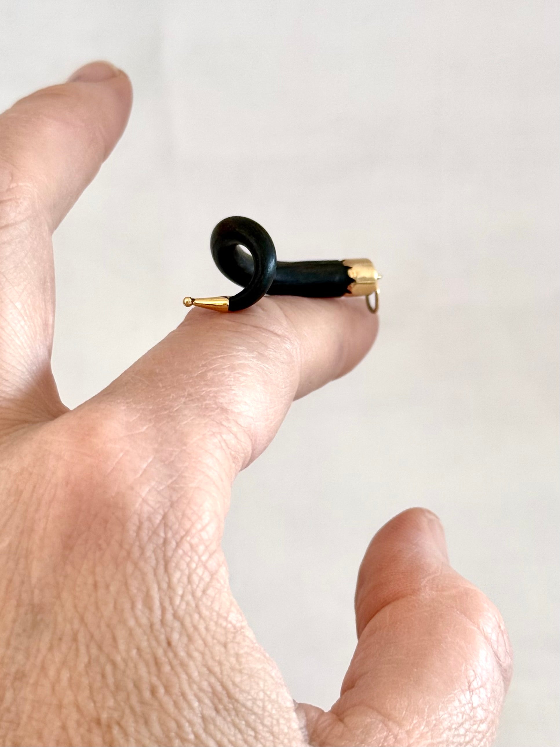 The genuine horn pendant is possibly attributed to be a small Chobe bushbuck antelope yet the miniature spiral twist makes me believe it is a carved good luck amulet to mimic the curves of a larger antelope horn.