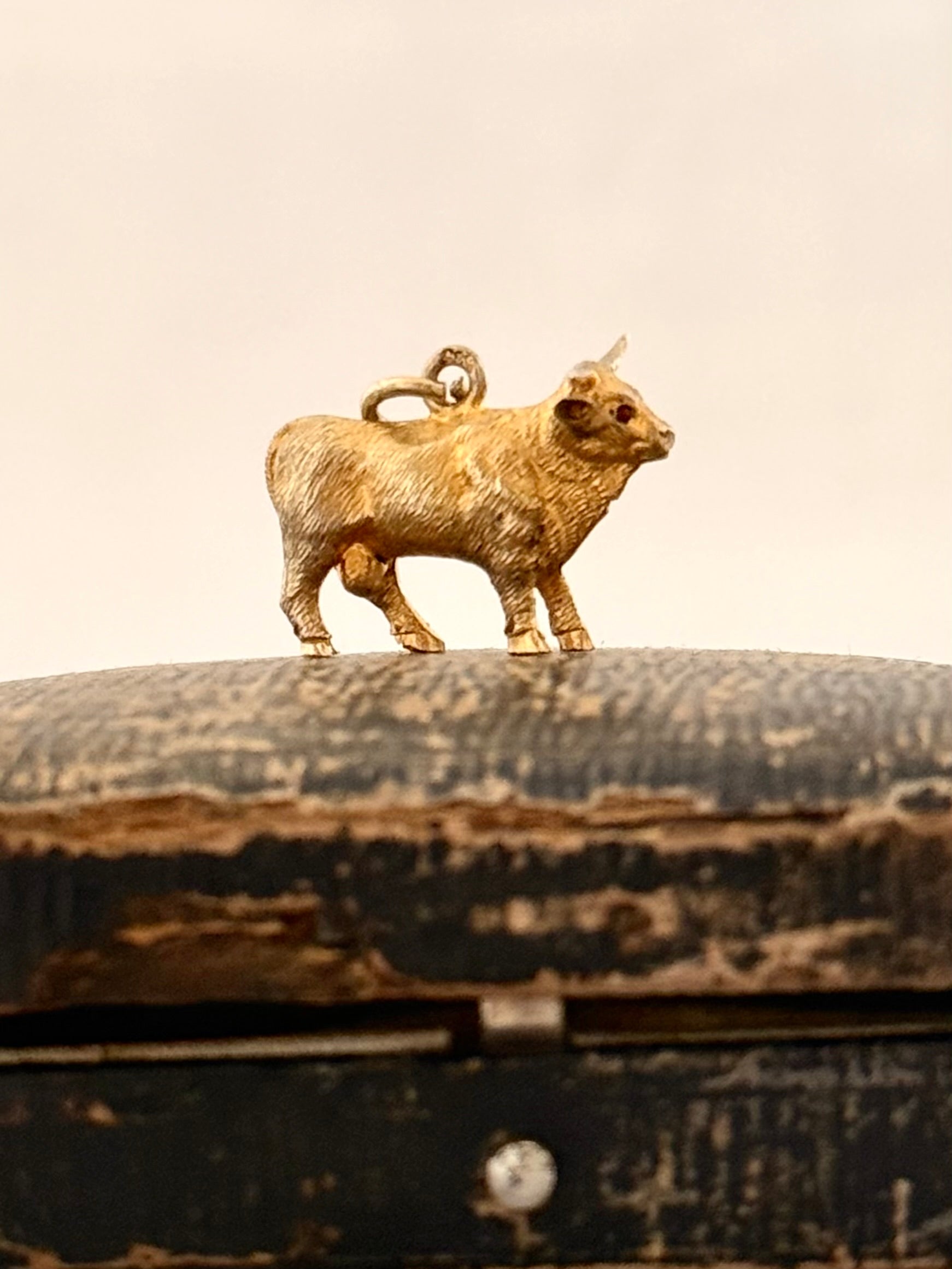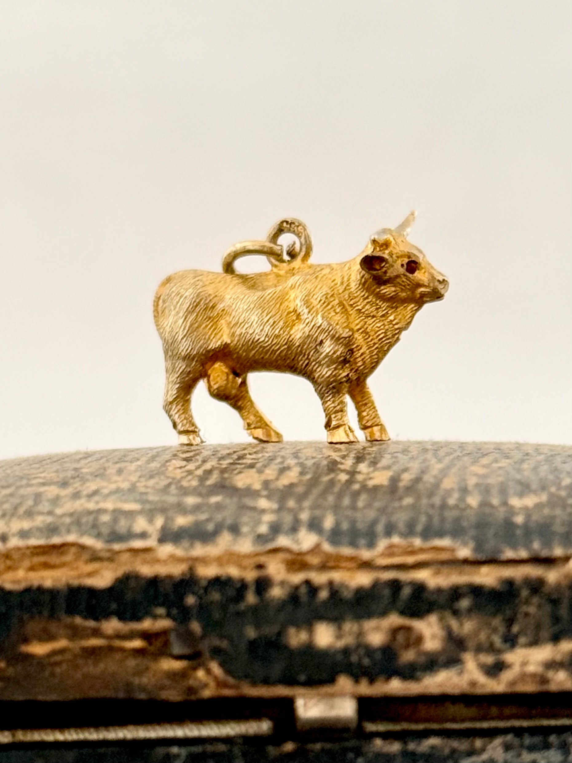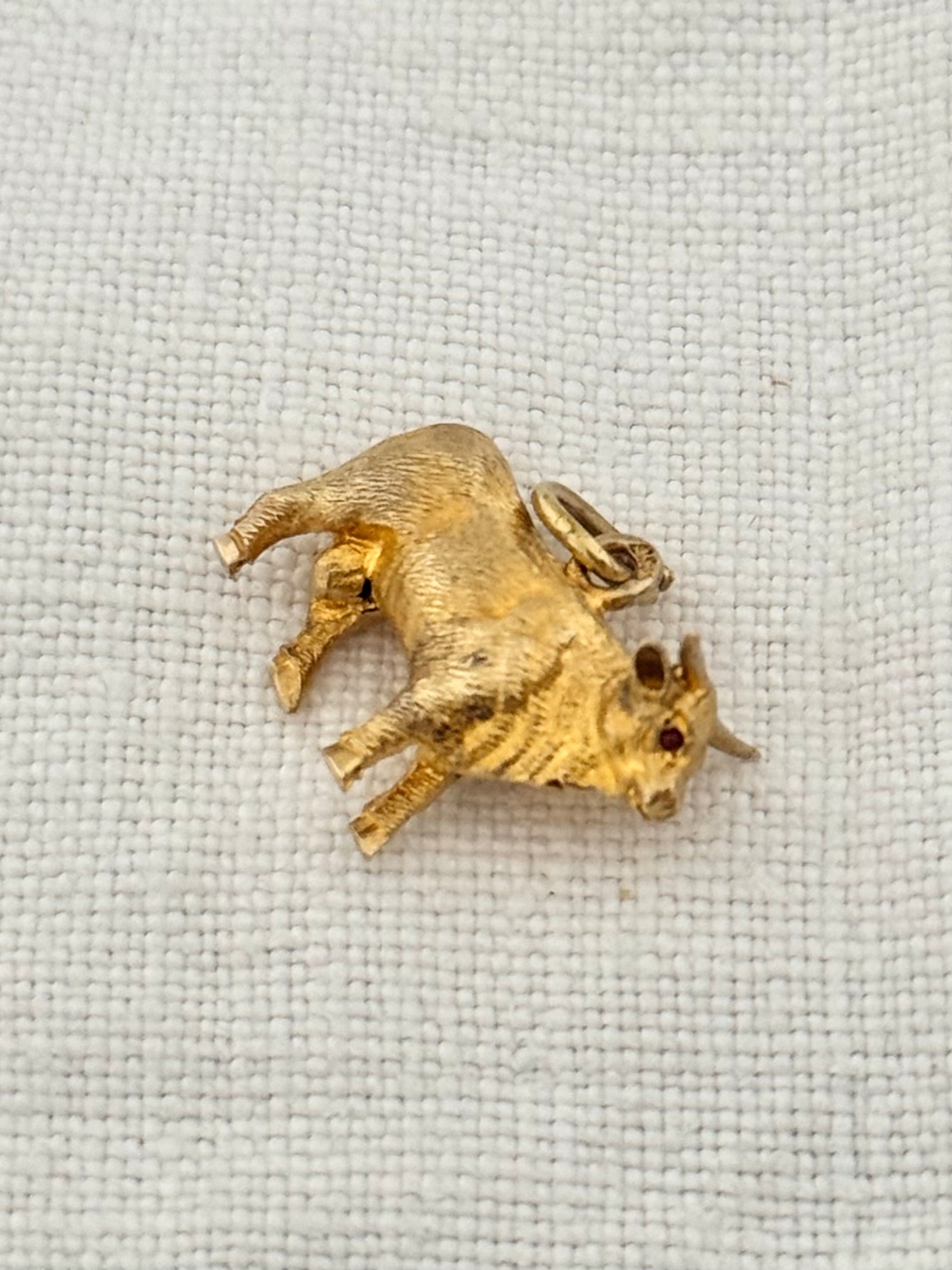 .14ct .1890s .1900s artisan crafted 585 yellow gold finely detailed Longhorn Heifer Bull figural charm with ruby eyes pendant