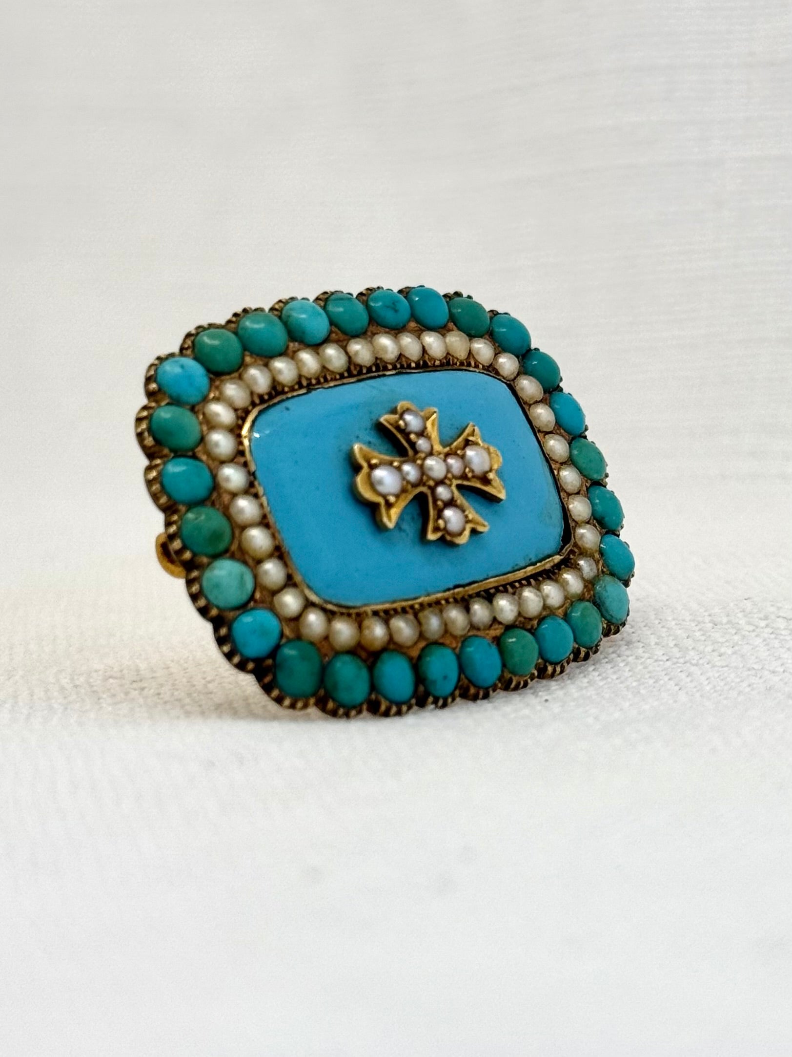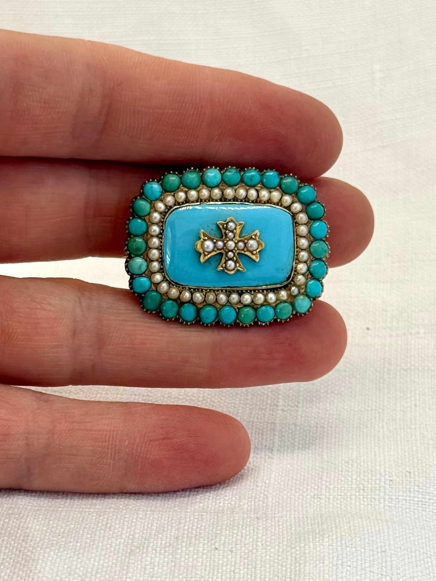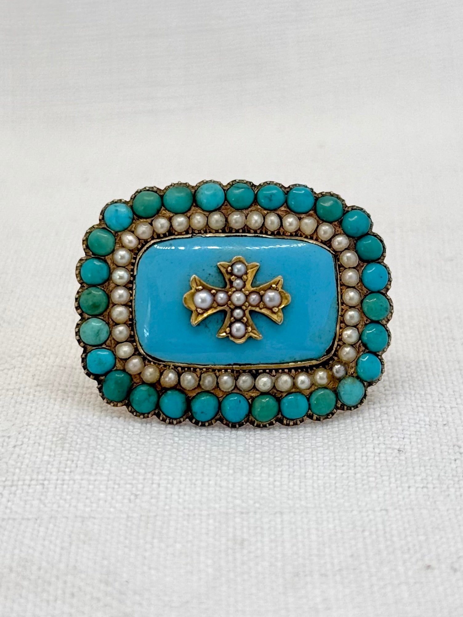 Truly magnificent, this antique rectangular early 1800s Turquoise and Pearl brooch is set in high carat gold. 28 Turquoise beads frames the outside of the brooch with 37 smaller seed pearls sitting snuggly between the Turquoise beads and the blue enamel centre. The blue enamel is also turquoise in colour and is finally adorned with a gold Maltese cross that is accented with 9 smaller and graduating seed pearls.