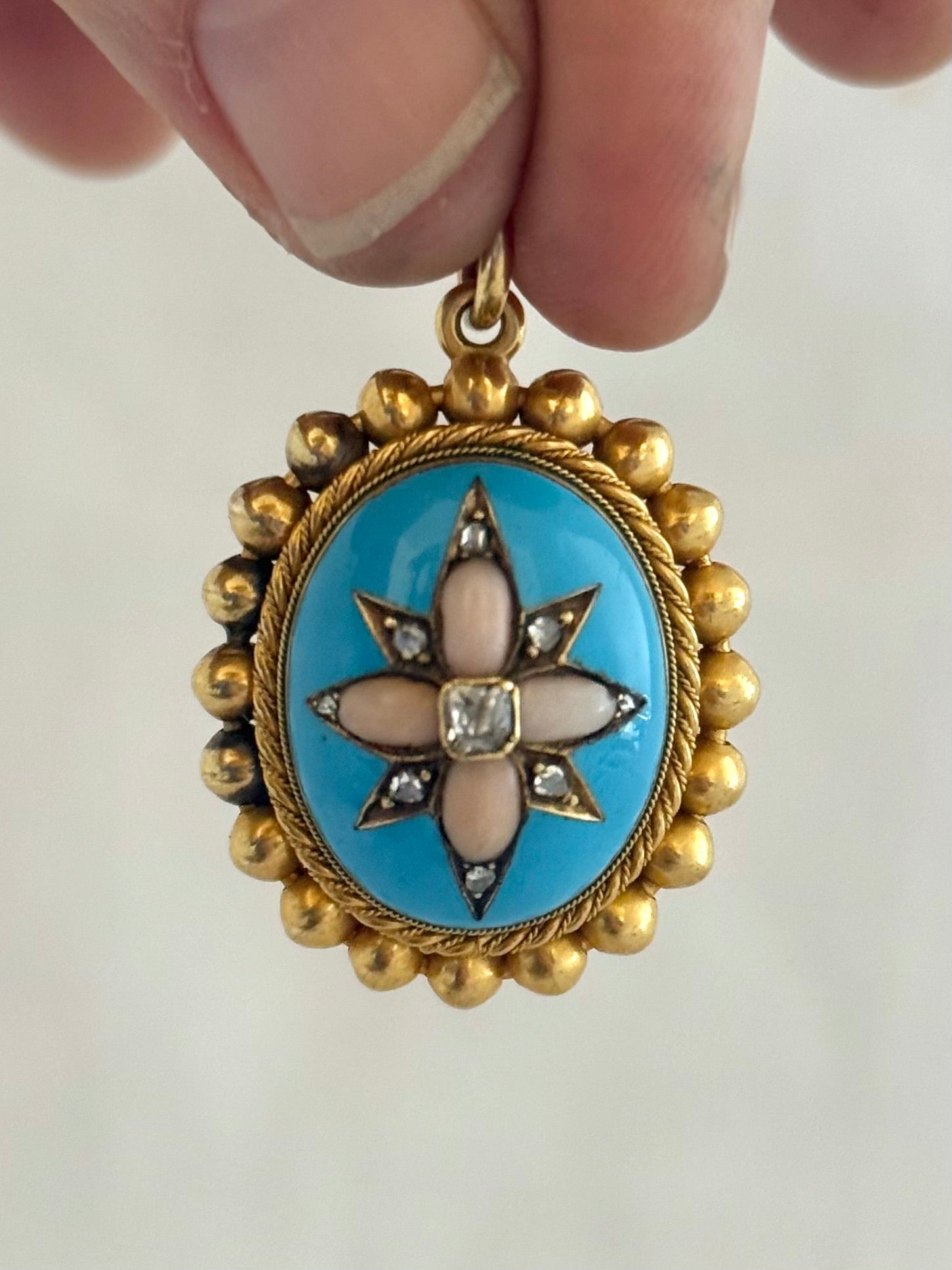 .15ct .1850s .1860s antique Victorian Yellow Gold Cushion cut Diamond Rose Cut Diamond star starburst Angel Coral and Blue Enamel Etruscan Revival Beaded border Mourning locket pendant