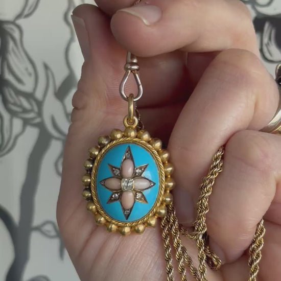 This exceptional Victorian locket pendant is crafted in high carat yellow gold and is perfectly coloured with a robins egg blue enamel centre.