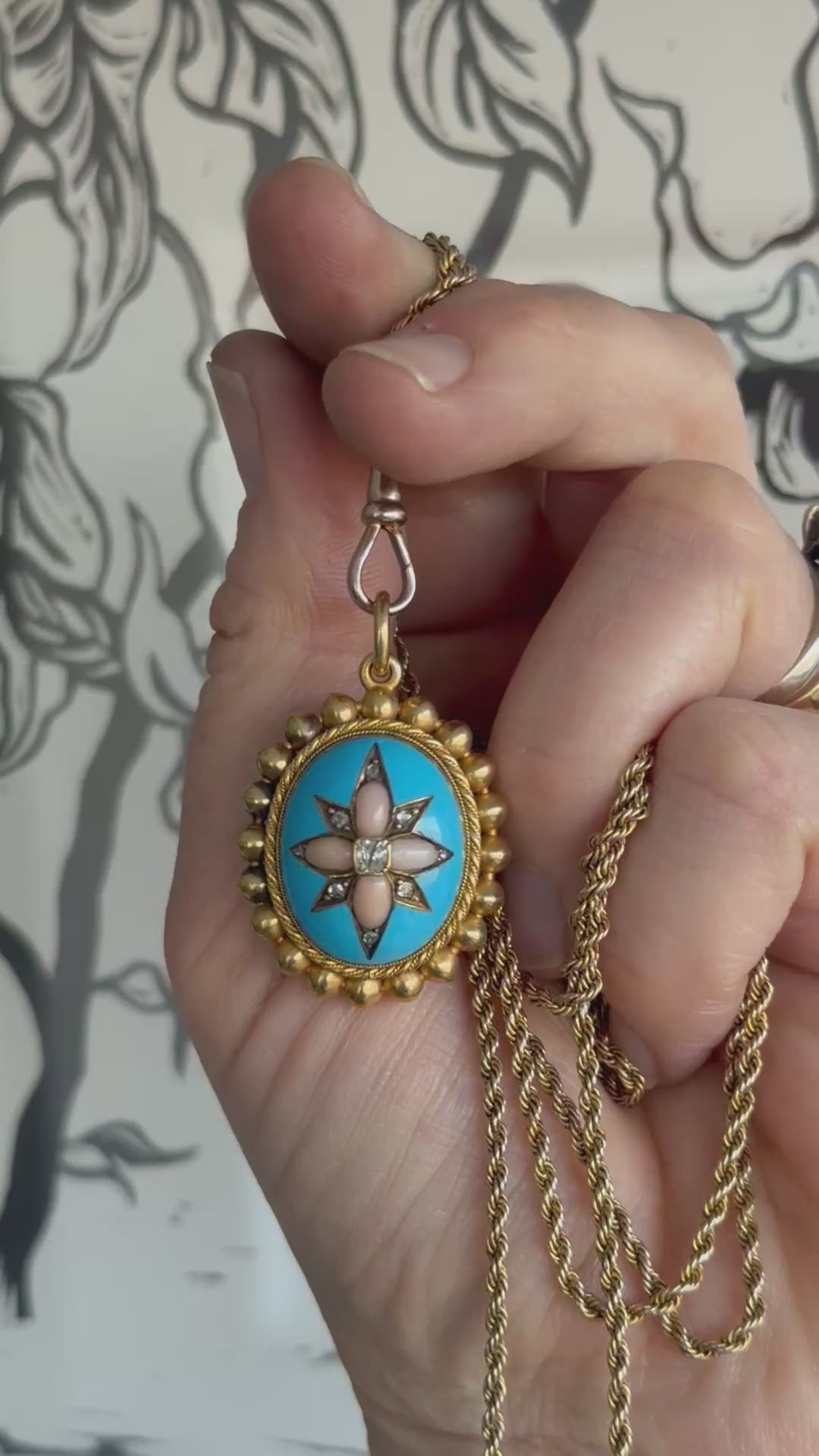 The captivating starburst design is gemstone set with 4 light pink Angel Coral cabochons radiating outwards from a central cushion cut diamond and with 8 diamond set star points. The border of this high rise, enamel detailed locket is an Etruscan style gold bubble frame with a fine twisted rope border cuff lying on the inside of the frame.