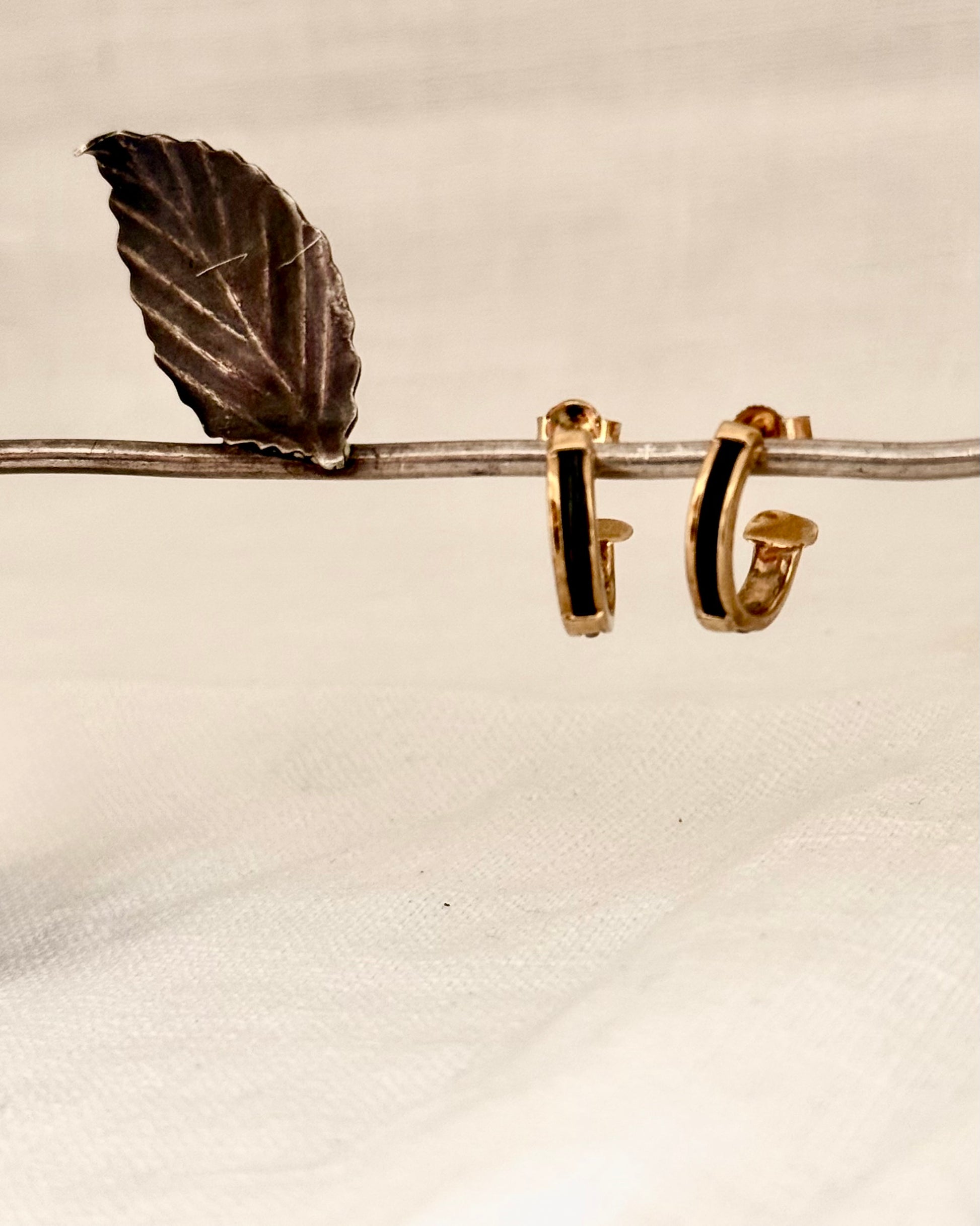 A gorgeous pair of 375 gold marked huggie earrings which are accented with a strand of organic Elephant hair that sits within the groove of the gold hoop earrings.