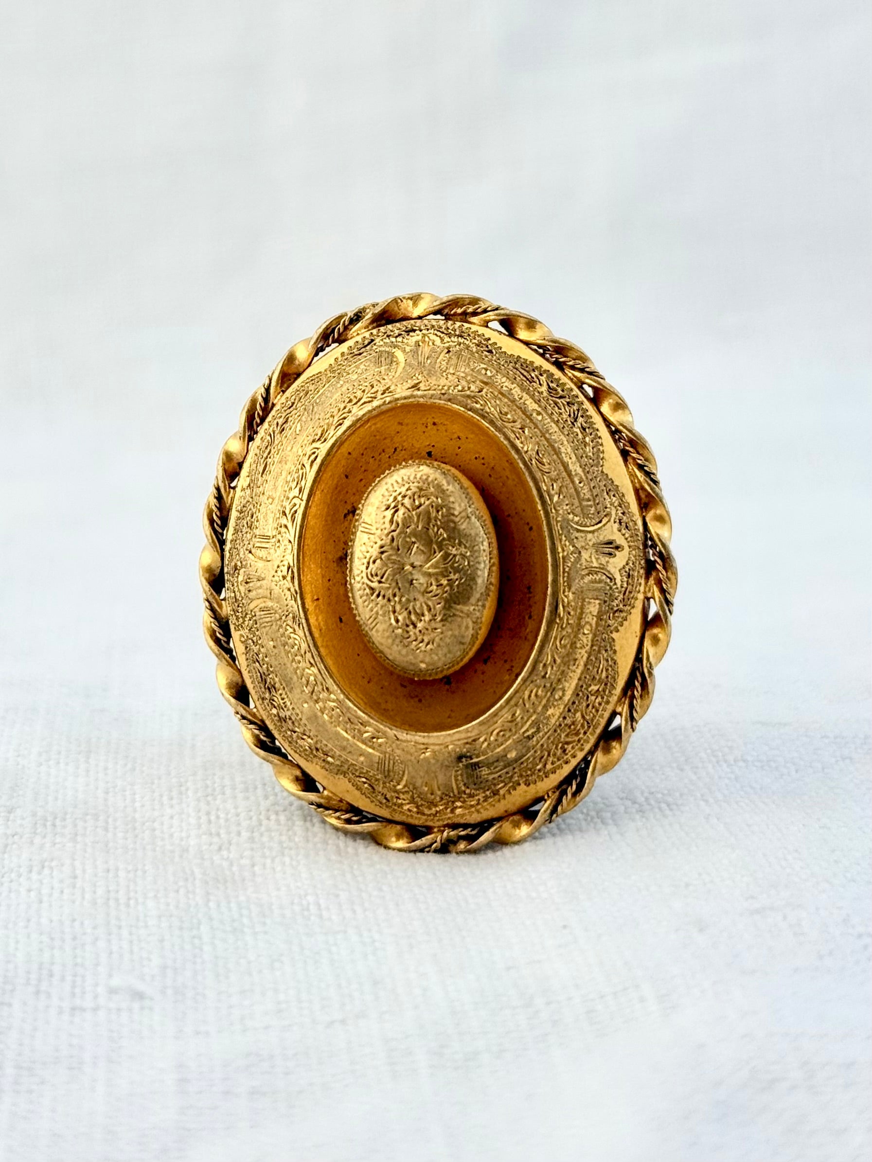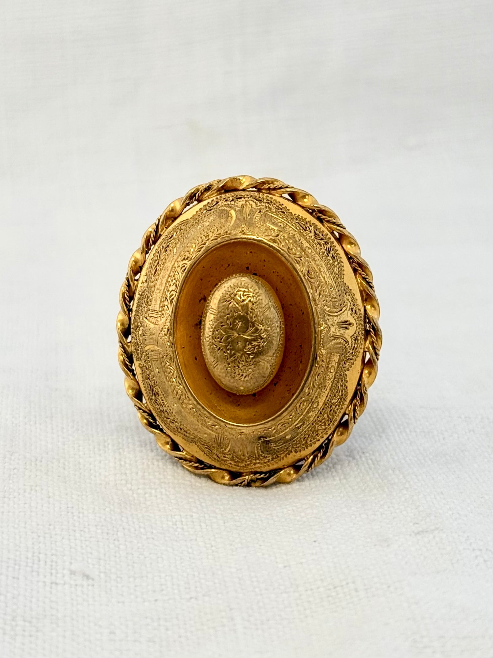 This antique, yellow gold Pinchbeck oval target brooch dates from the Grand Victorian Period.