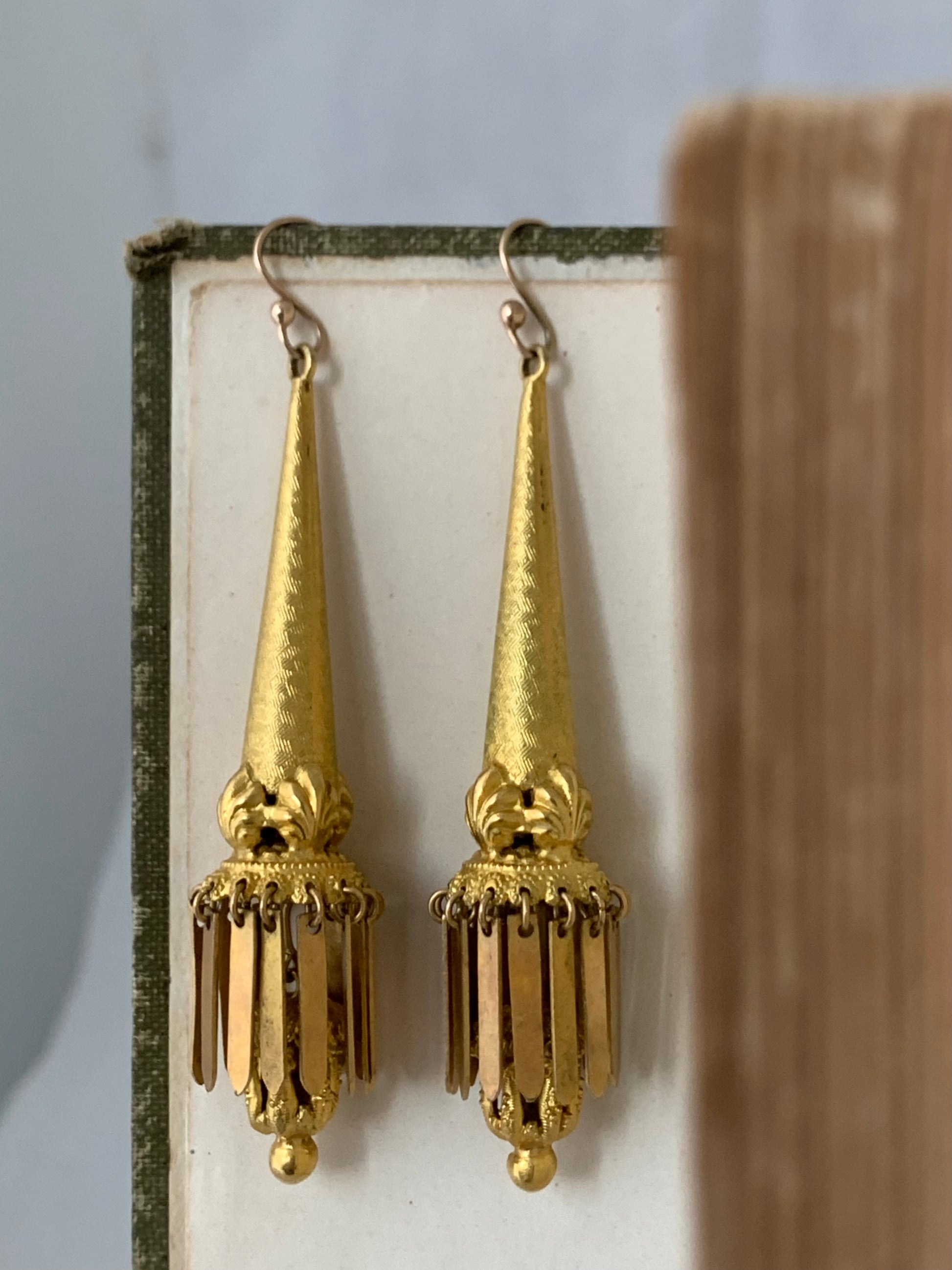 A spectacular find - a true early 19th century treasure, these long torpedo chandelier dangle earrings are crafted in pinchbeck and gilded in a rich and thick 18ct yellow gold. The earring drops hang at 78mm long, hanging on two 9ct gold shepherd hooks.