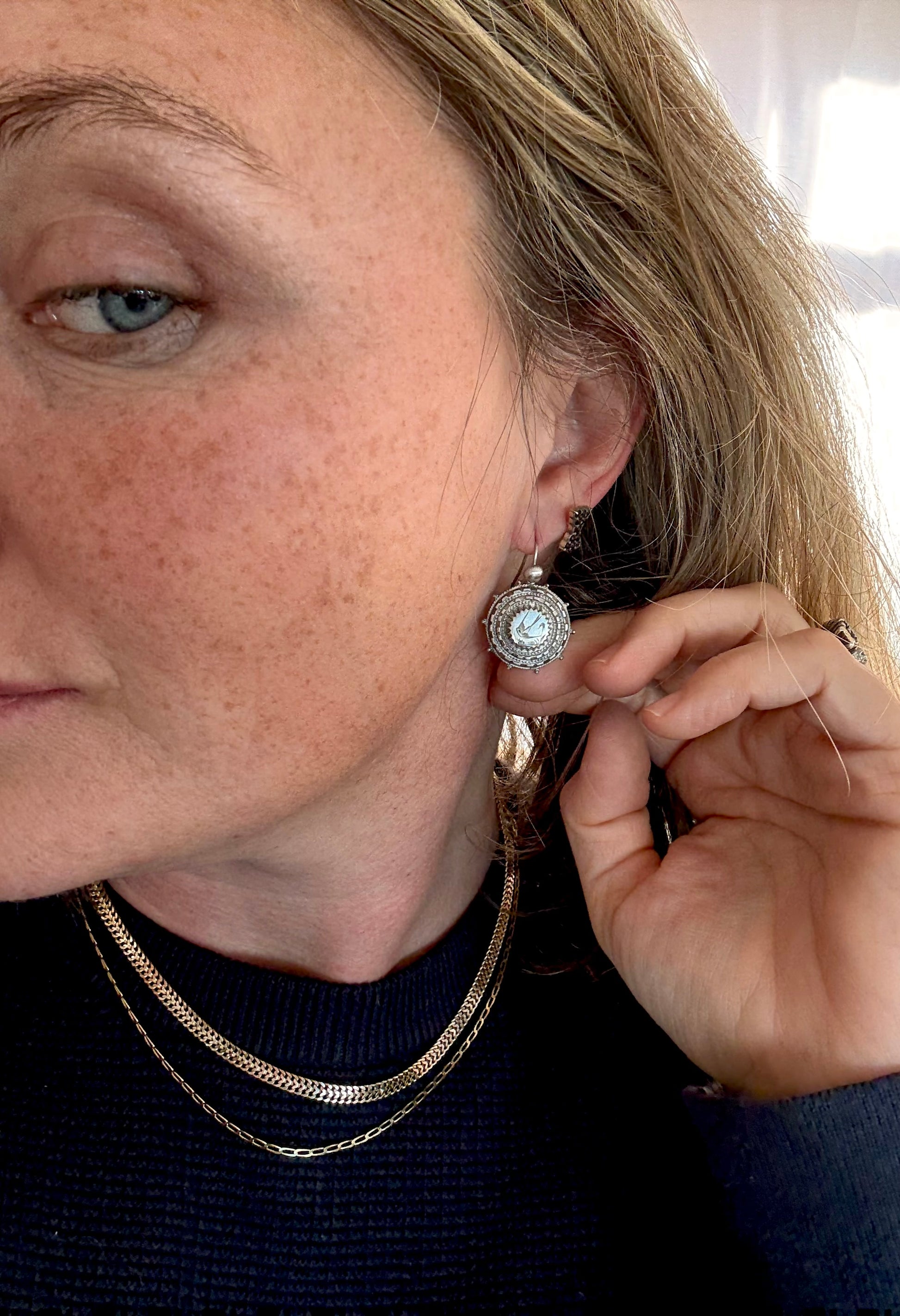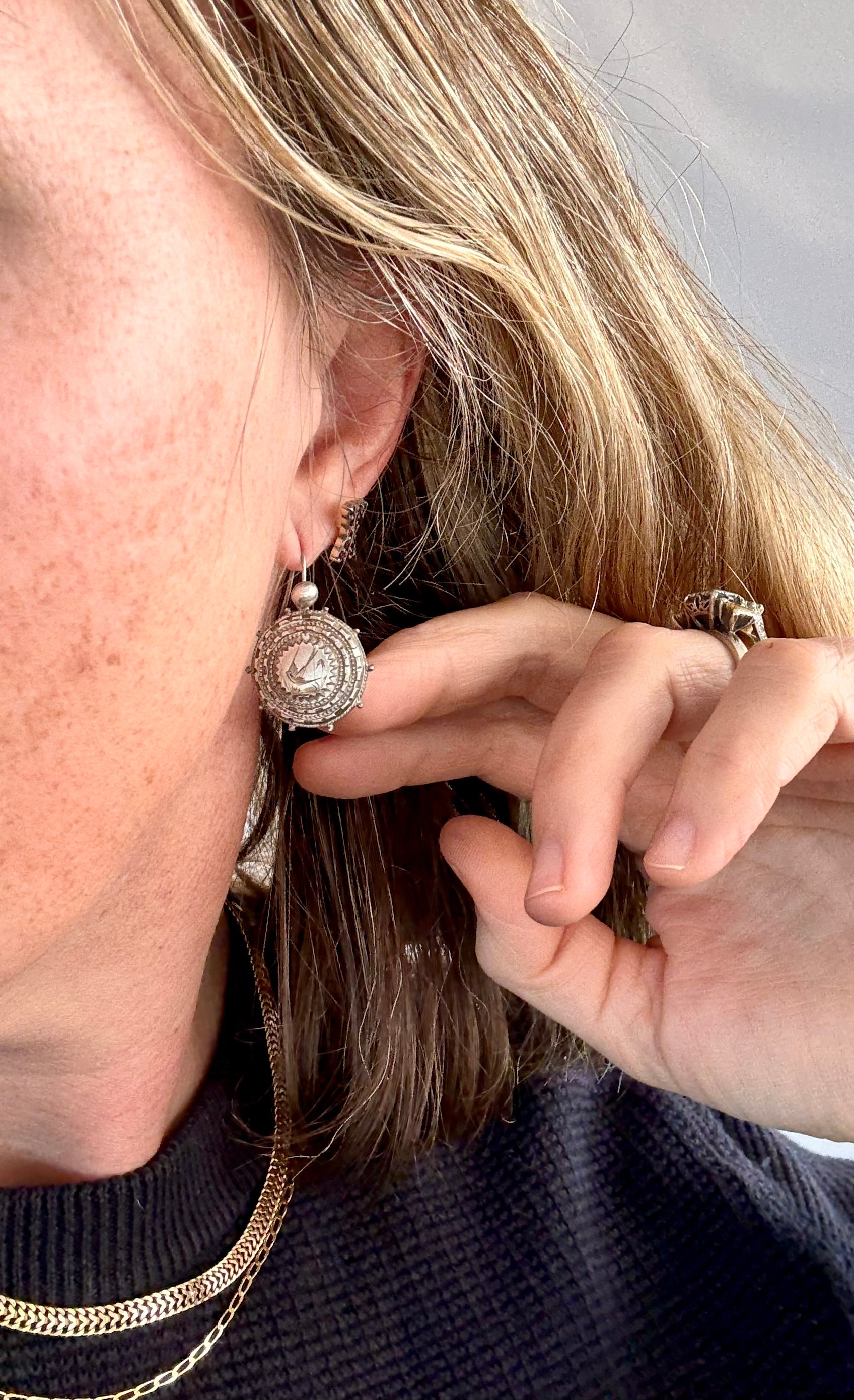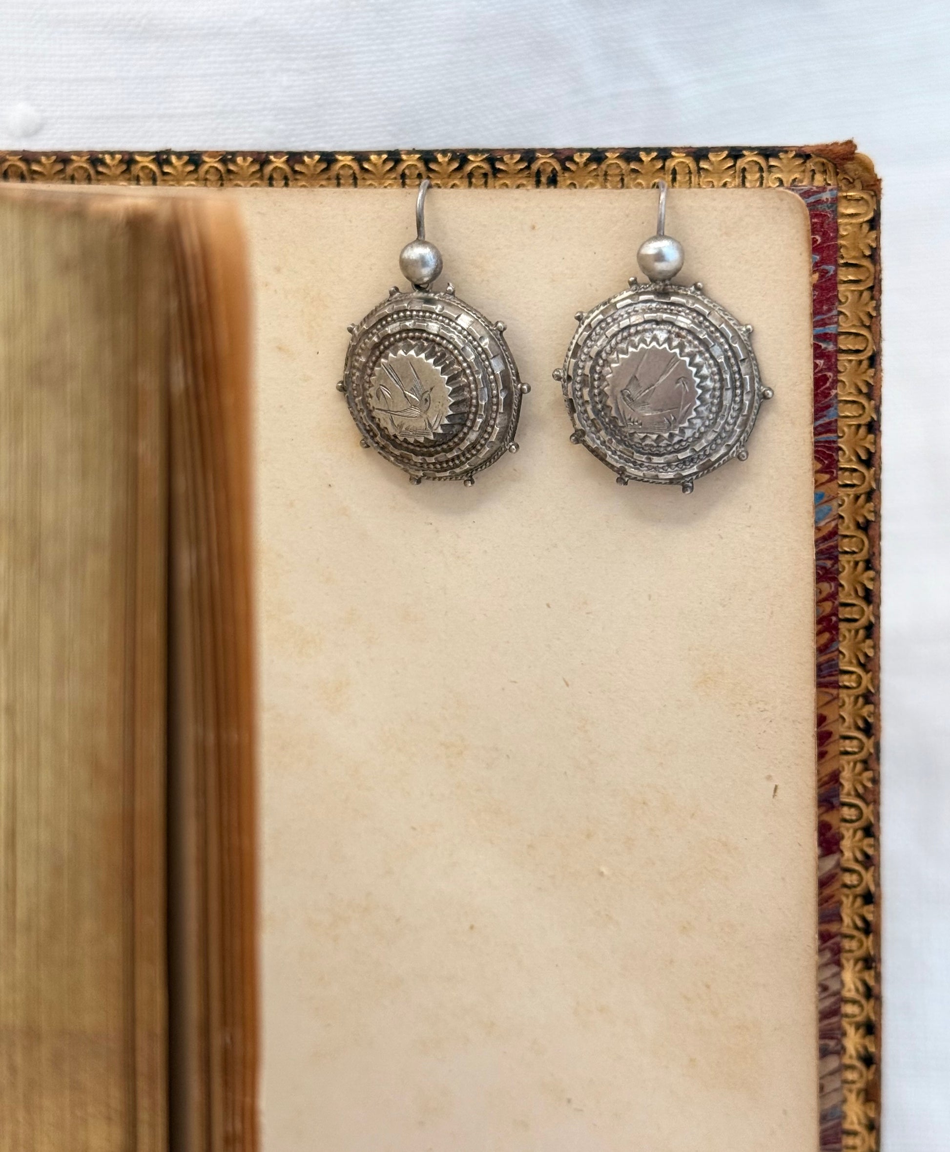 This exceptional pair of Victorian round silver drop earrings are highly detailed in marked “solid silver”. The domed silver earrings each has dimensions of 20mm diameter x 30mm total hang from their fine, hand-formed shepherd hook earring findings.