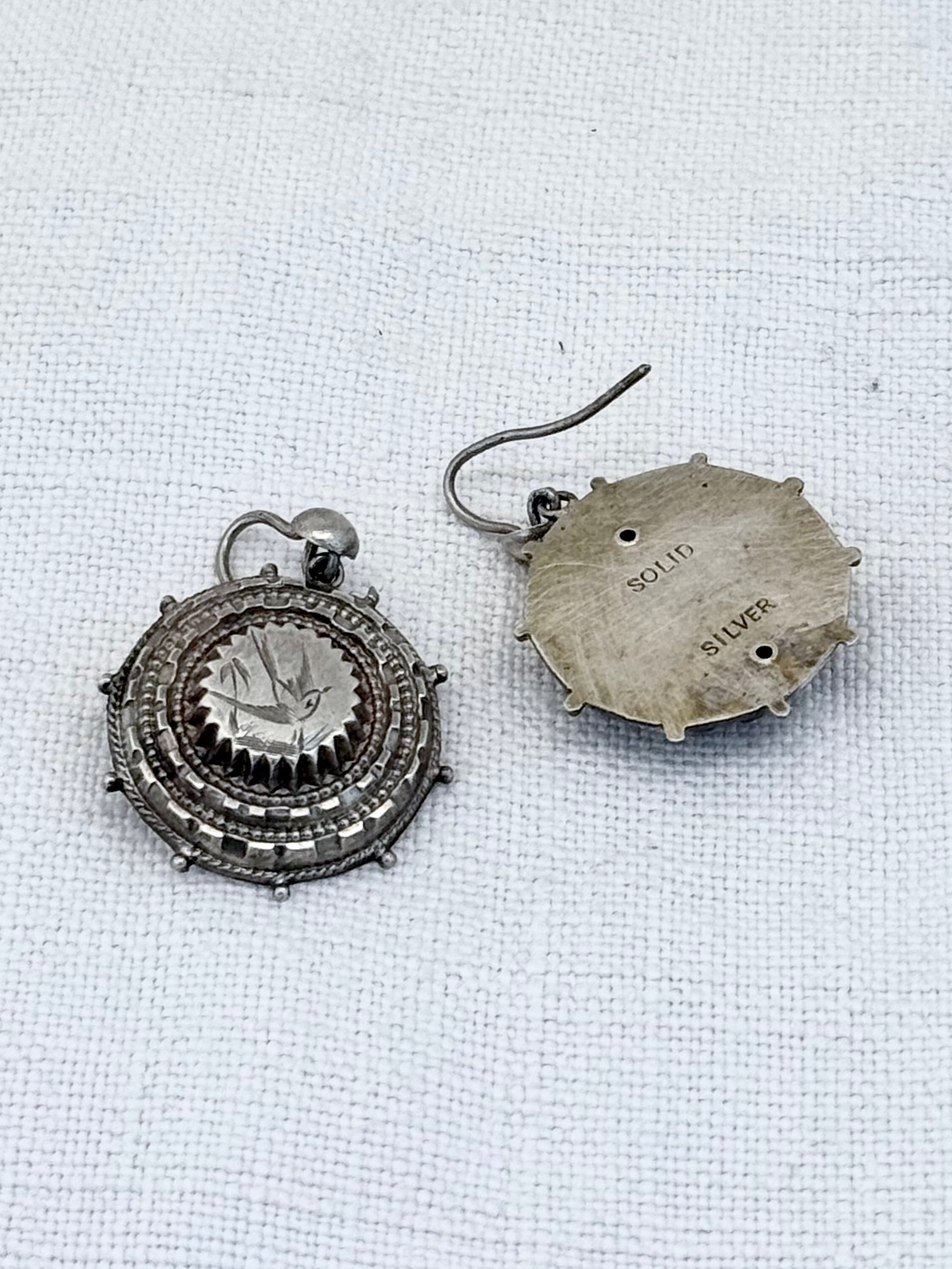 .1870s .1890s .925 Aesthetic Movement Etruscan revival rare and magnificent Victorian antique silver swallow bird sweetheart drop earrings