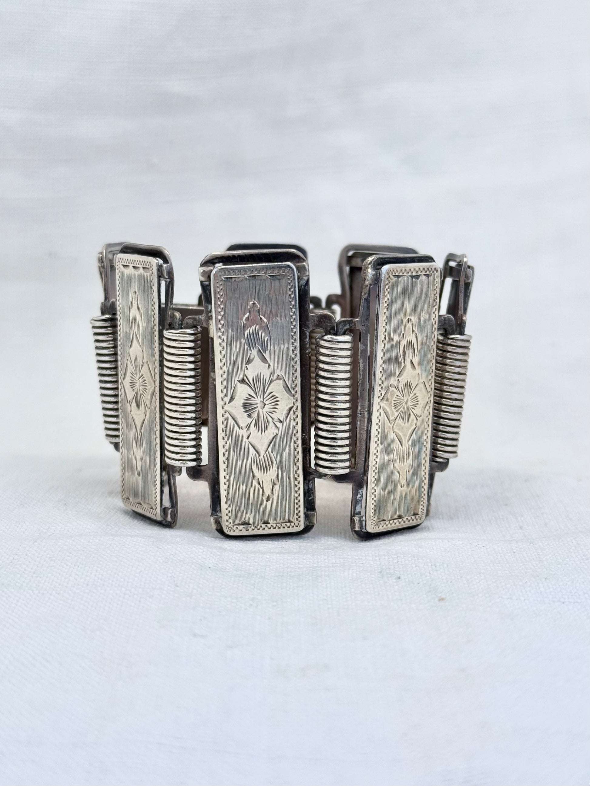 As per many silver pieces from this period, the bracelet is unmarked silver (tests as 925 silver) and weighs a magnificent 117.6 grams in weight! The 7 x wide panels links up to run a total of 20cm in length.