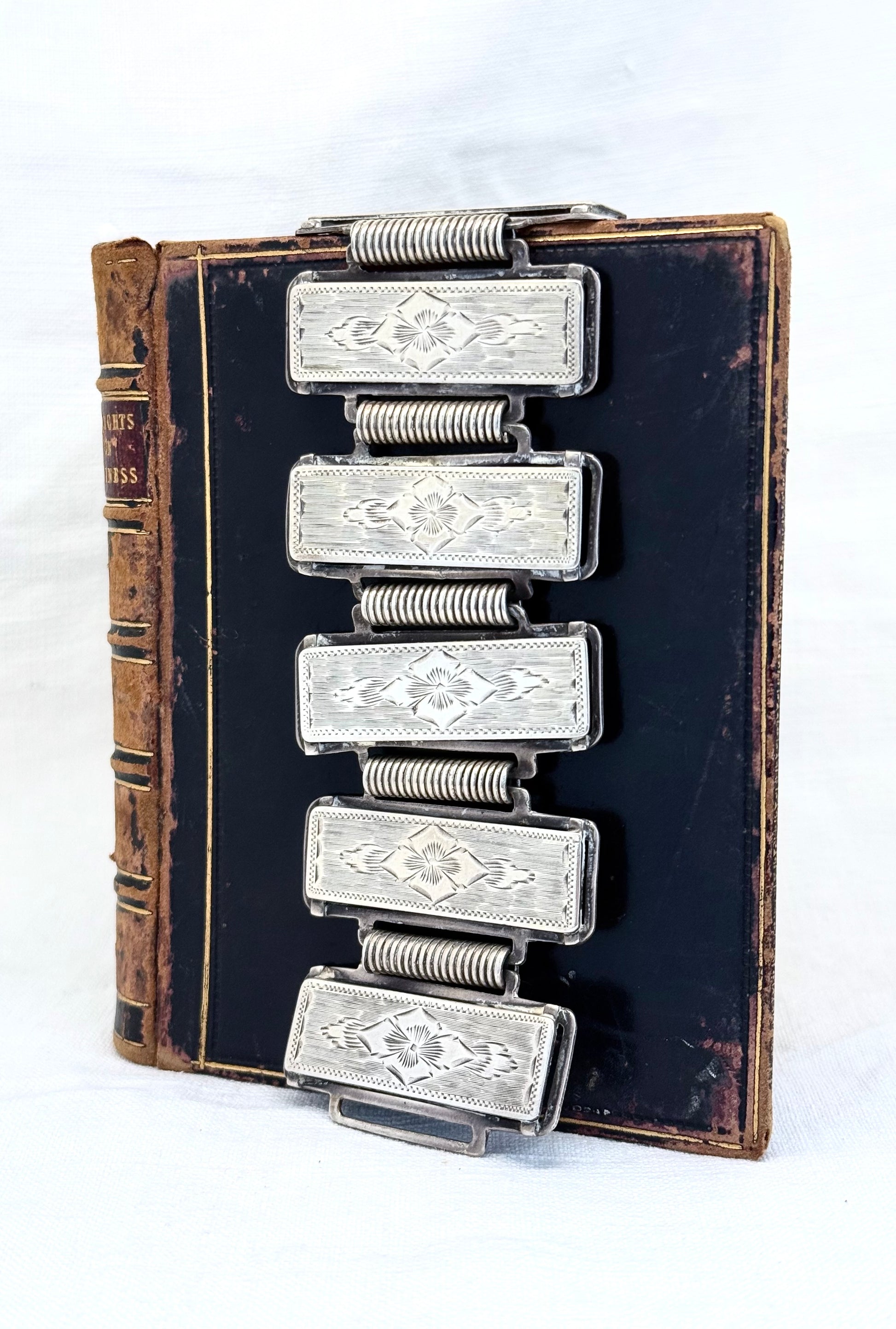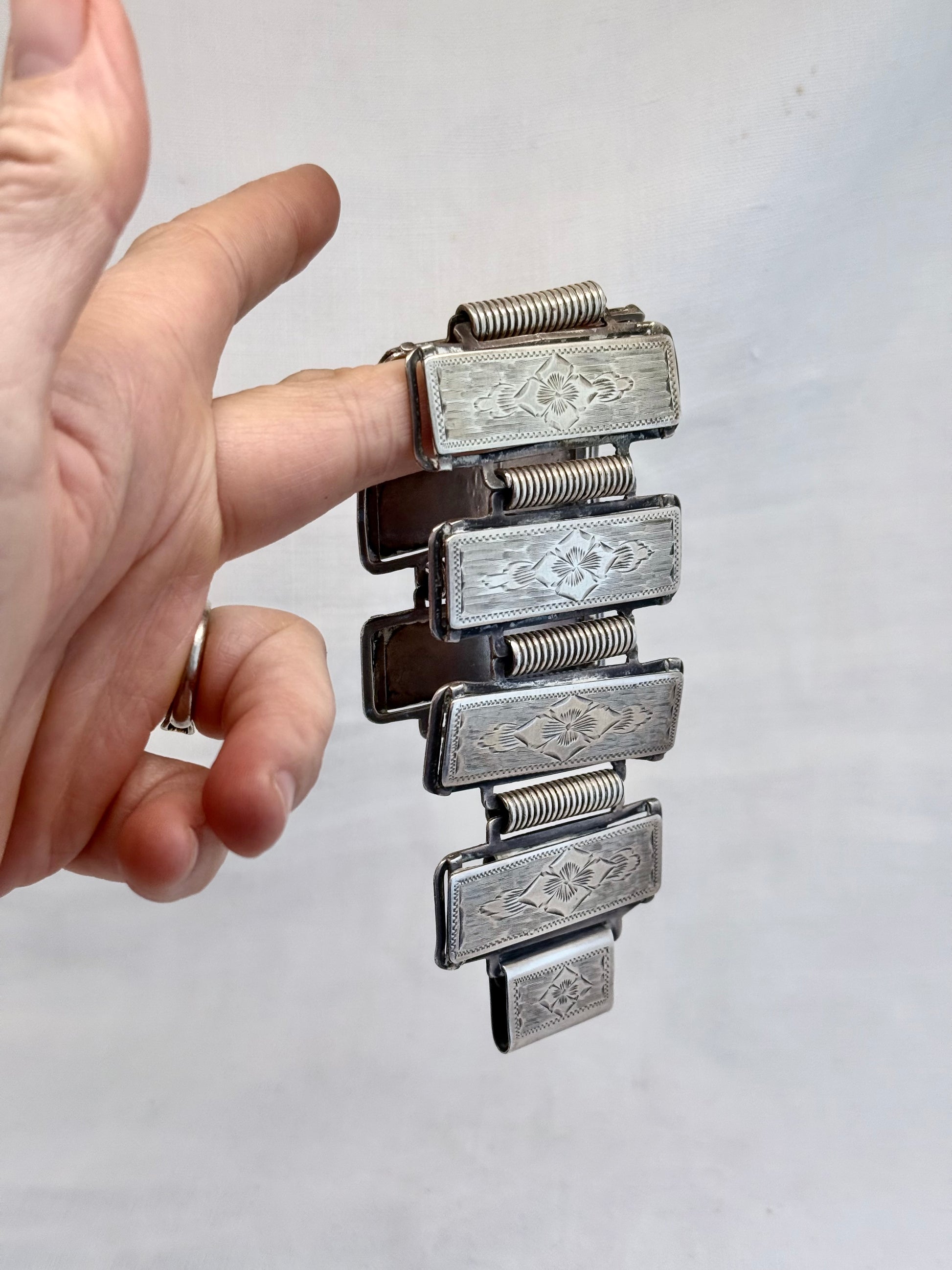 An incredible find - this striking, wide link Victorian era sterling silver bracelet is hand made from 7 x 53mm wide silver hinged panels.