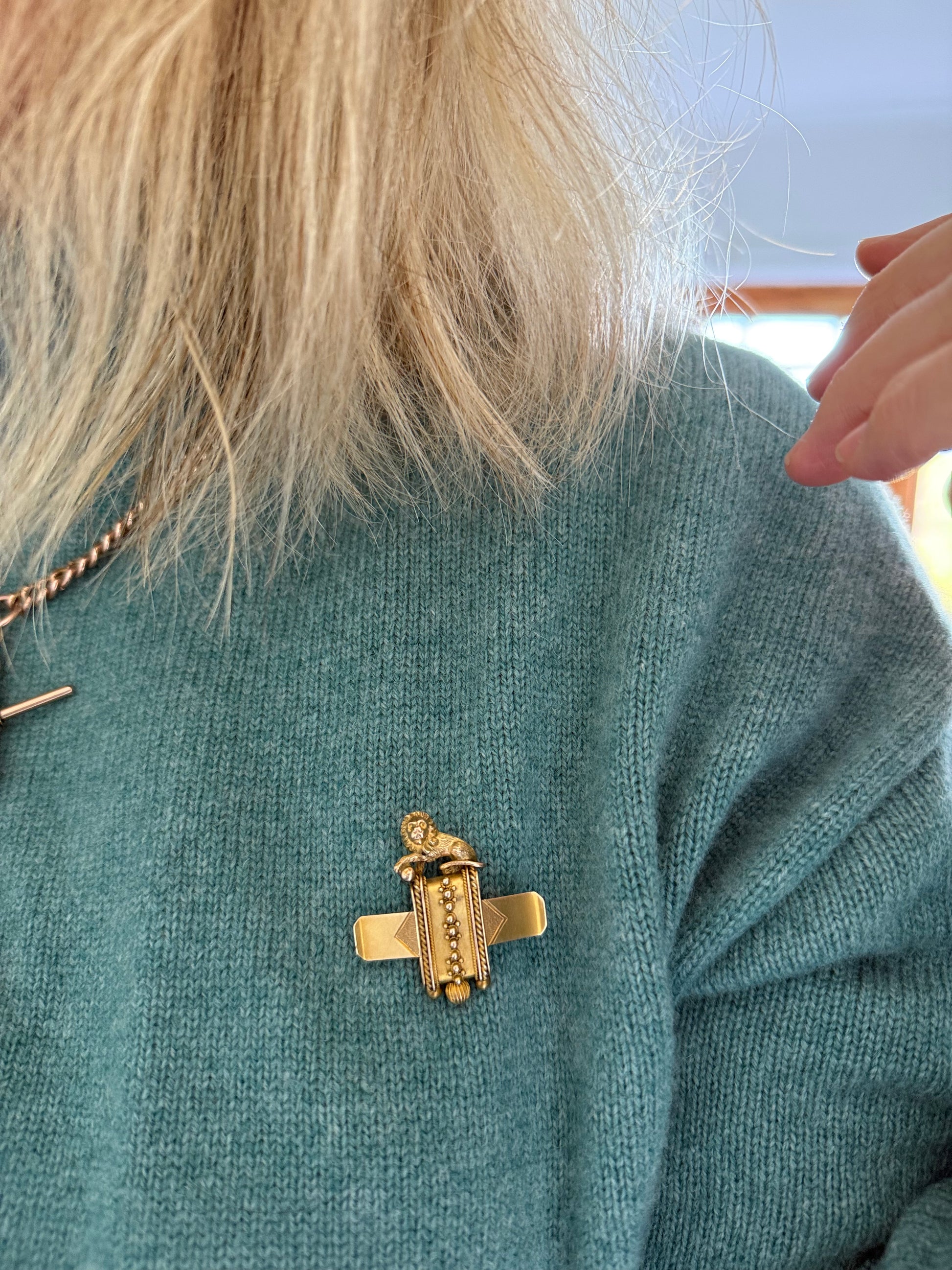 A captivating and historic Victorian Etruscan revival brooch from circa 1860s.