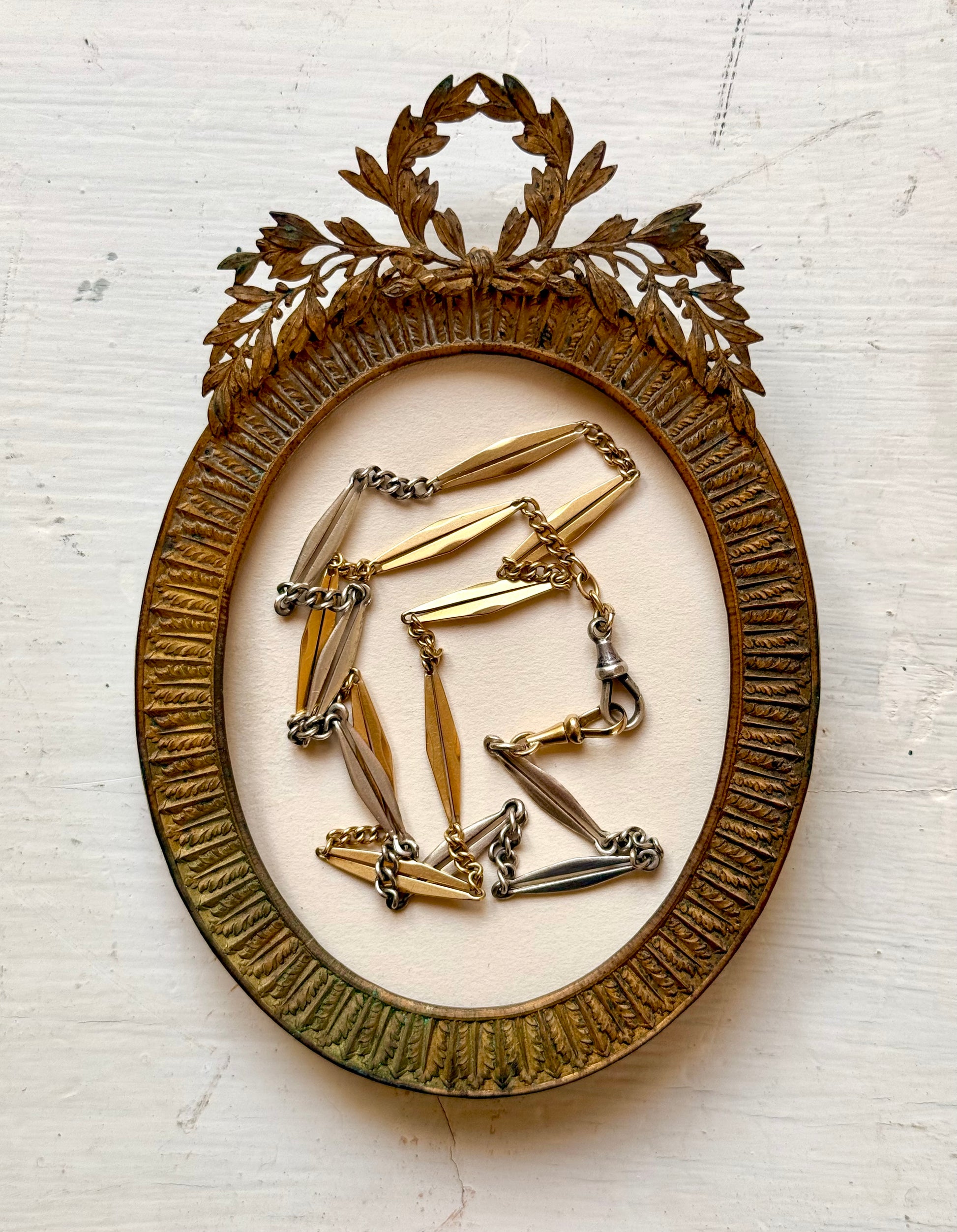 An antique treasure - this exceptionally beautiful 18ct gold fancy link heirloom chain is a high carat yellow gold Belle Epoque era watch chain paired with a near identical diamond shaped silver chain segment.