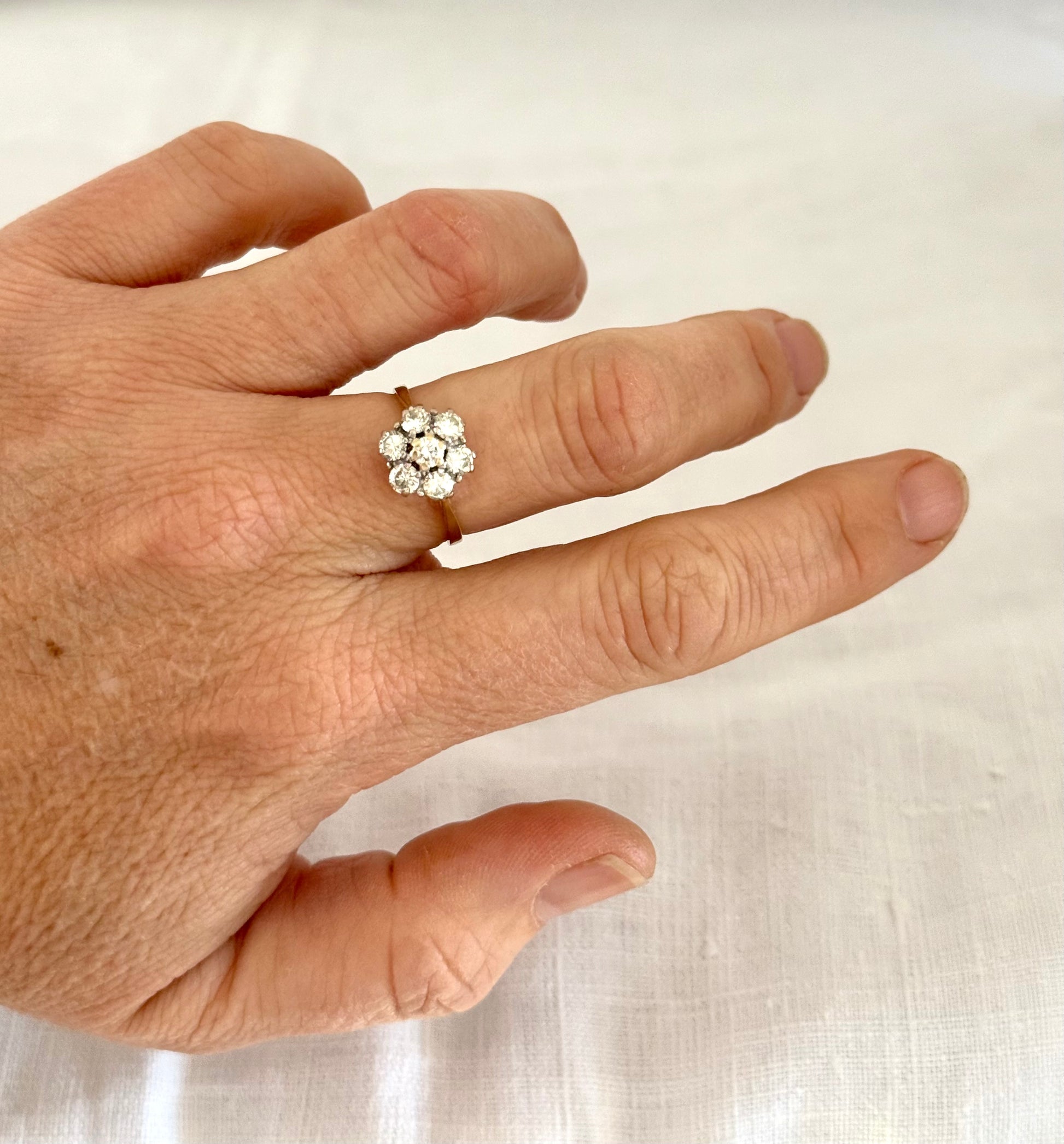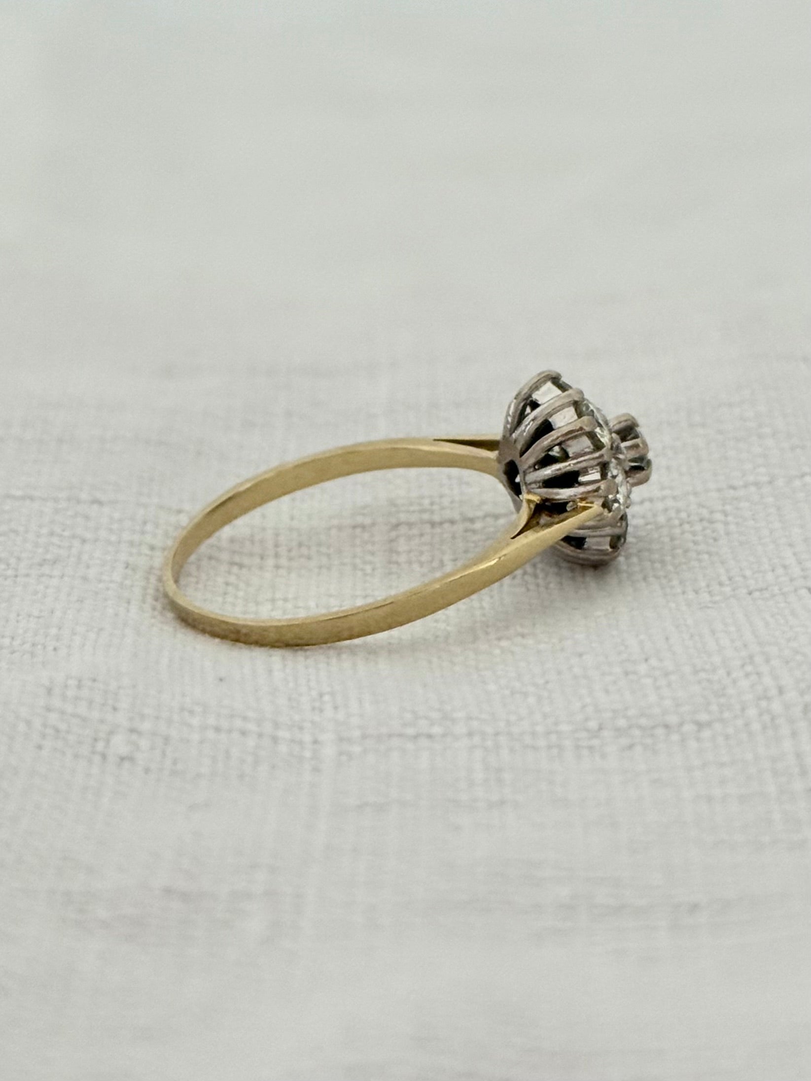 .18ct .1900s 1.00ct round brilliant antique floral cluster rosette high carat 750 yellow and white gold ring
