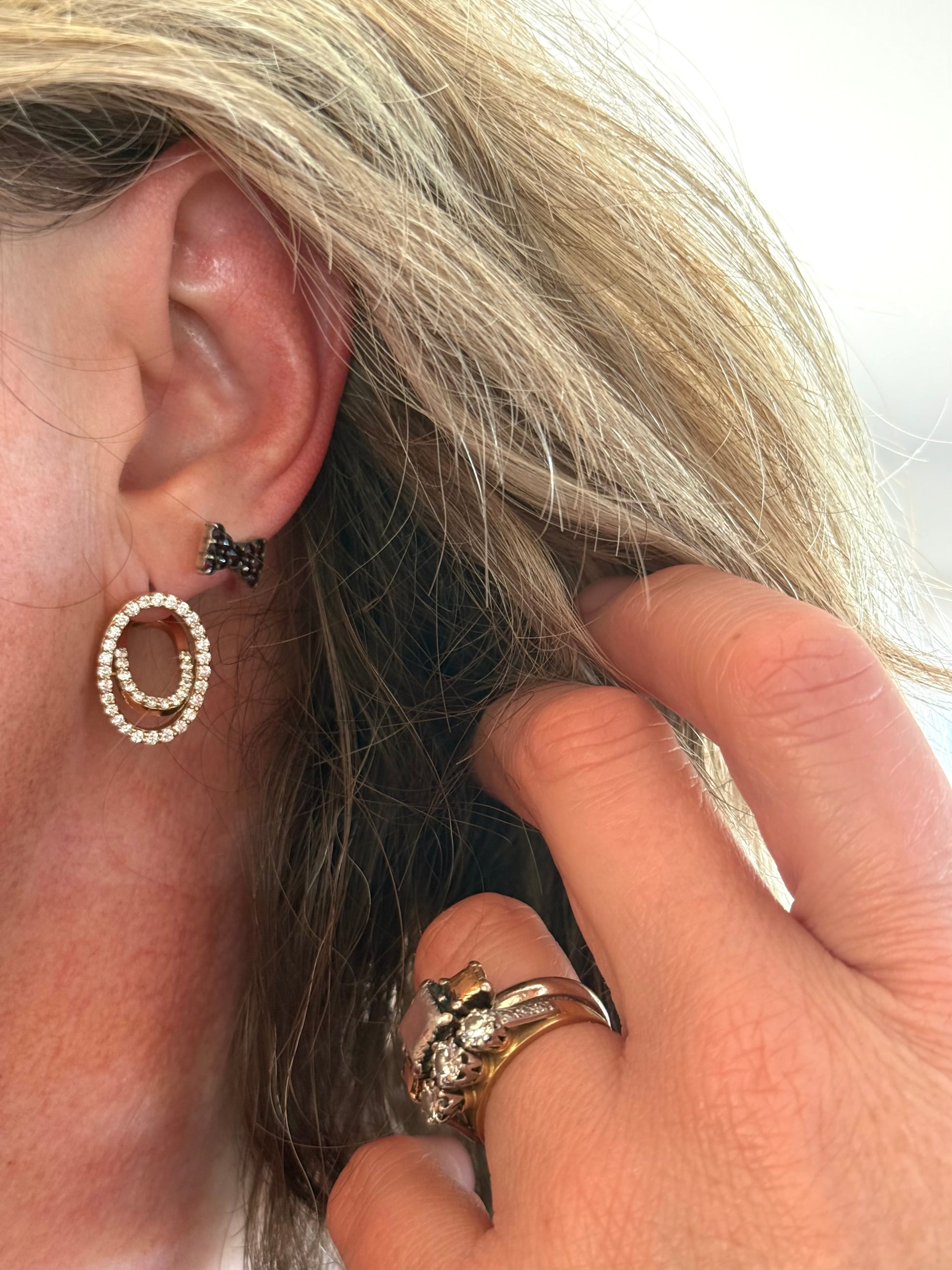Each earring is made up of two ovals that swivel in and out of each other to secure for comfortable wear. They are wonders of craftsmanship, with the two ovals creating a three dimensional visual that is truly unique and striking. The outside and larger oval is each studded with 27 well set, brilliant cut diamonds and has dimensions of 18mm x 13mm. The inside, smaller oval swivels into the larger oval to close the earring. The smaller oval is each studded with 13 brilliant cut diamonds and has its own dimensions of 16.5mm x 9mm.