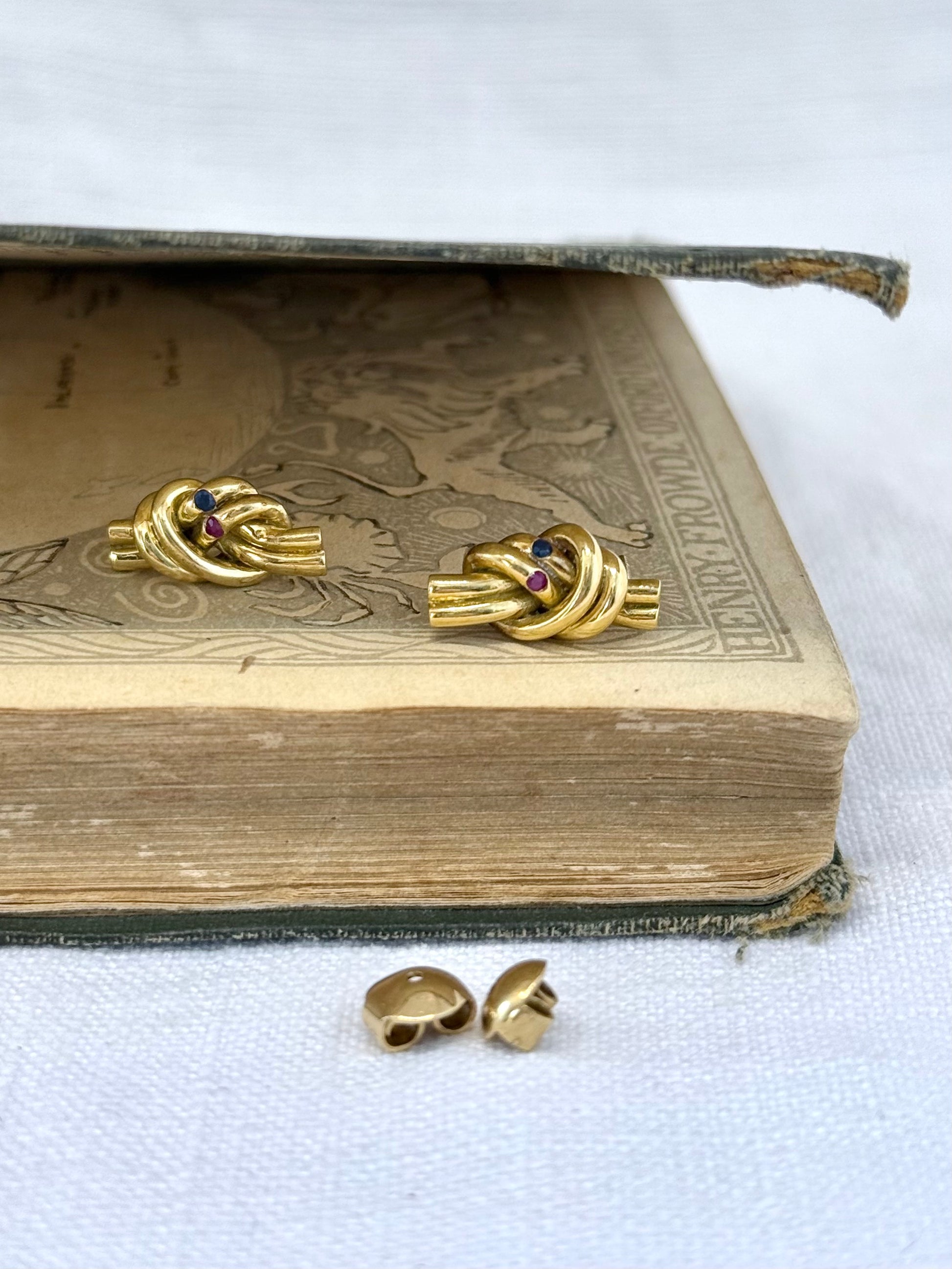 .18ct .750 artisan Brazilian made 18ct heirloom high carat yellow gold sapphire and ruby lovers knot luxury post stud push in earrings