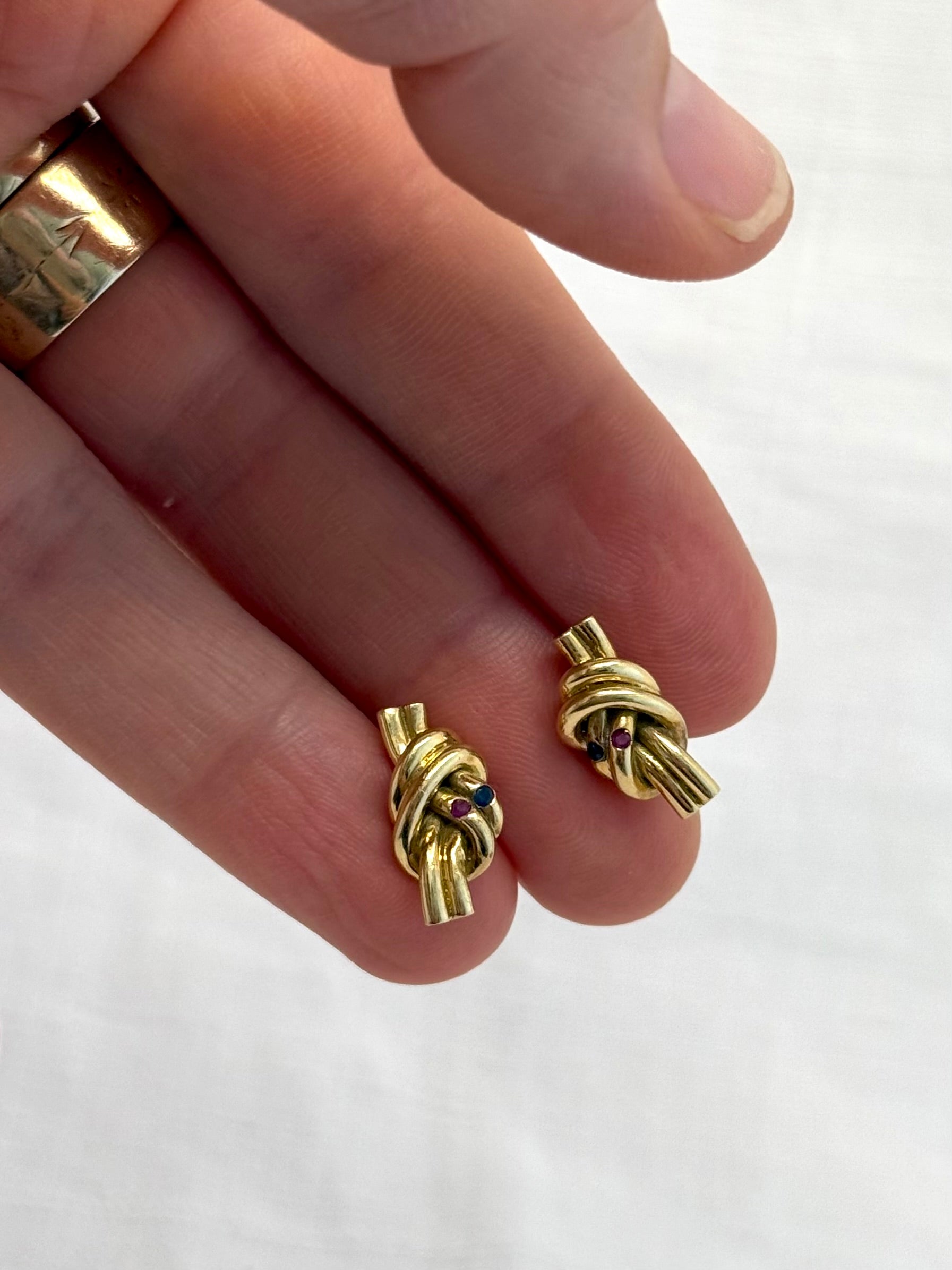 The 18ct gold knot earrings are each accented with a precious blue sapphire and pink rubies.