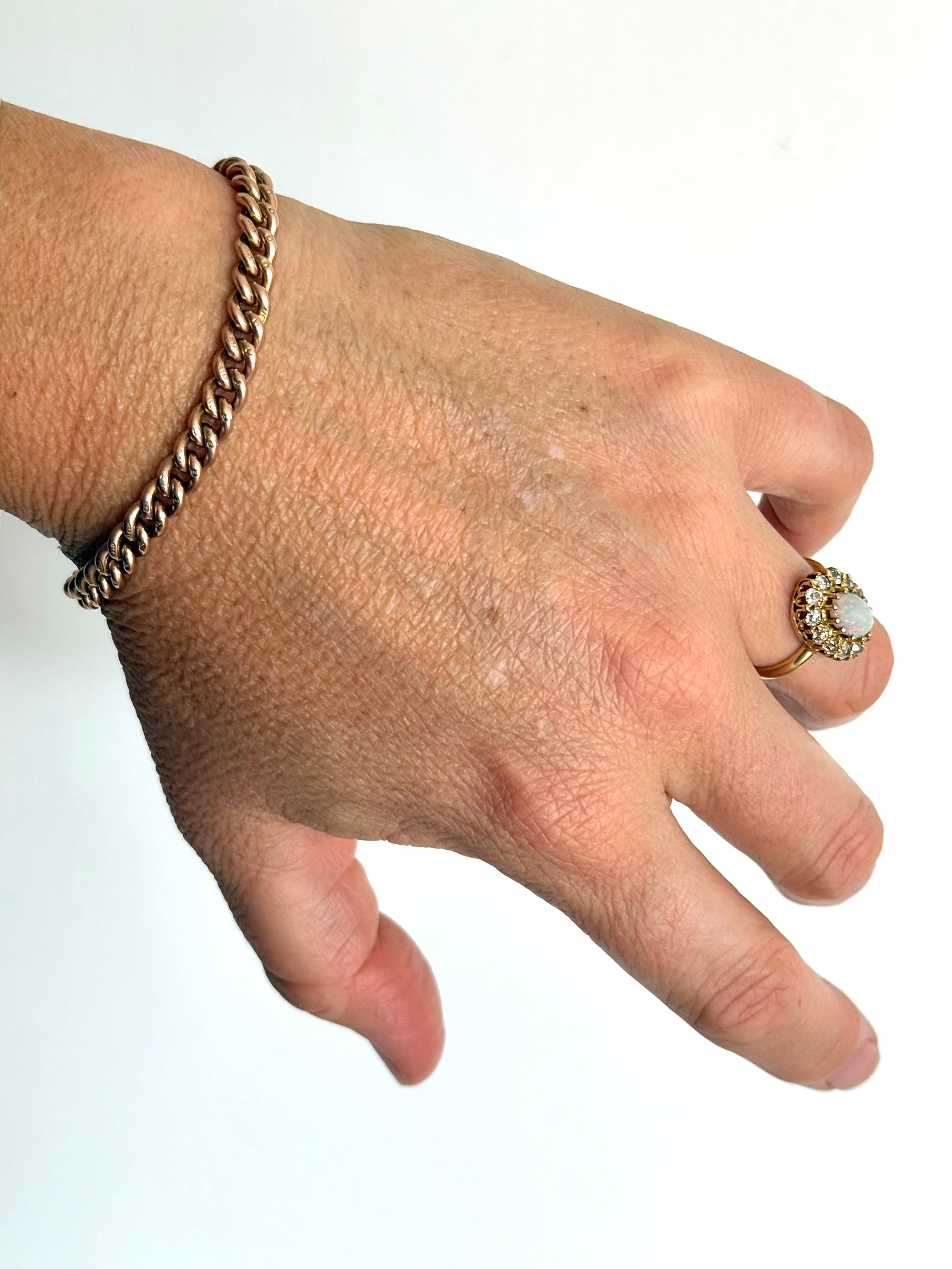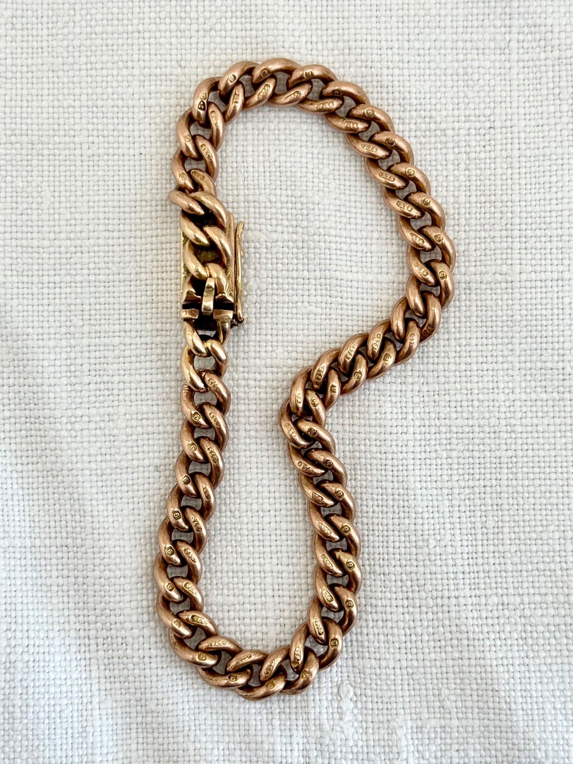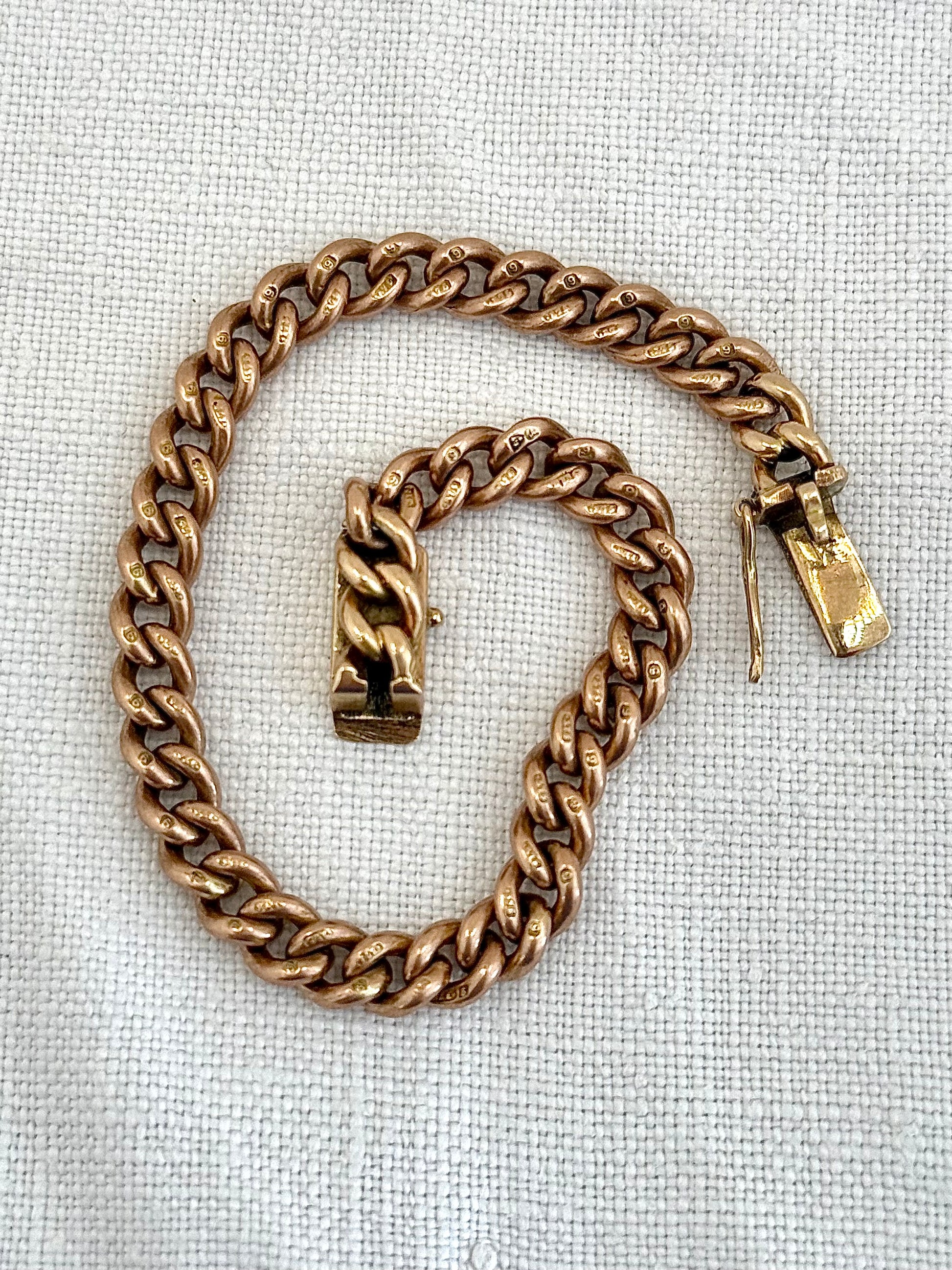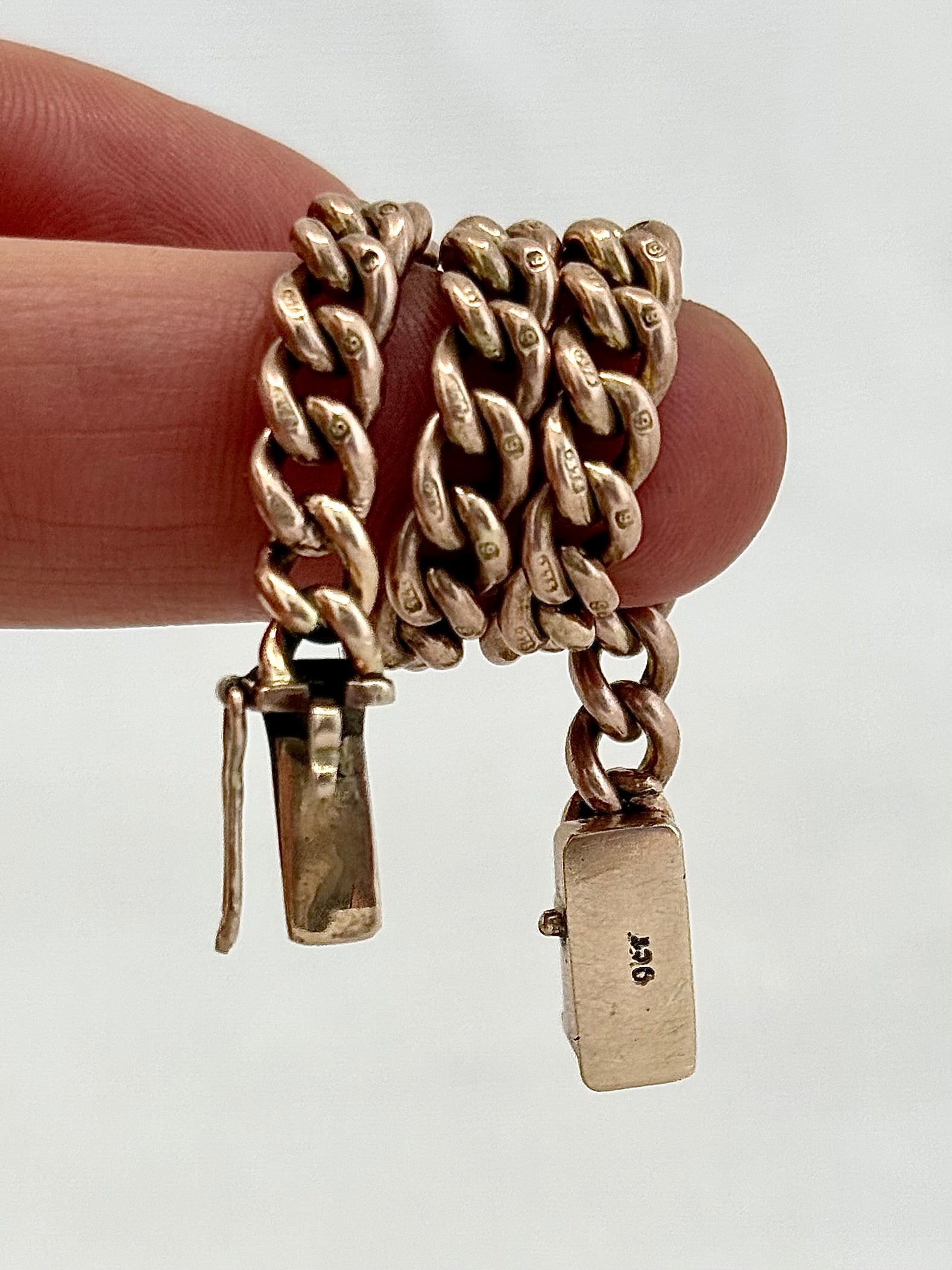 The solid gold curb links are clearly hallmarked for .375 9ct gold, with the most lovely warm rose gold colouring to it.