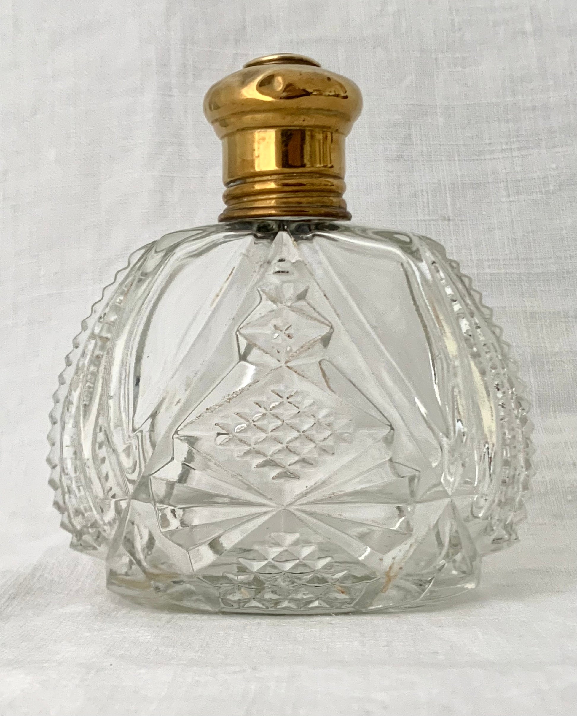 1900s Victorian Edwardian ornate glass and gold brass top beautiful perfume vessel bottle.