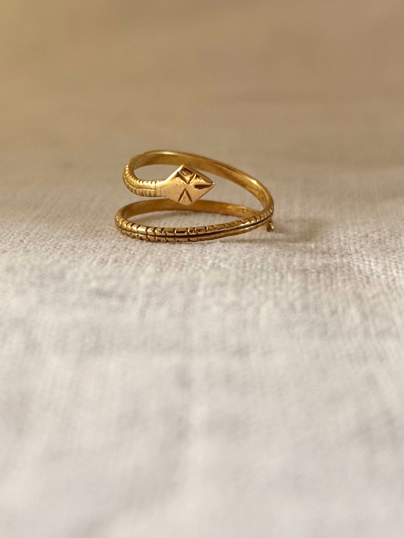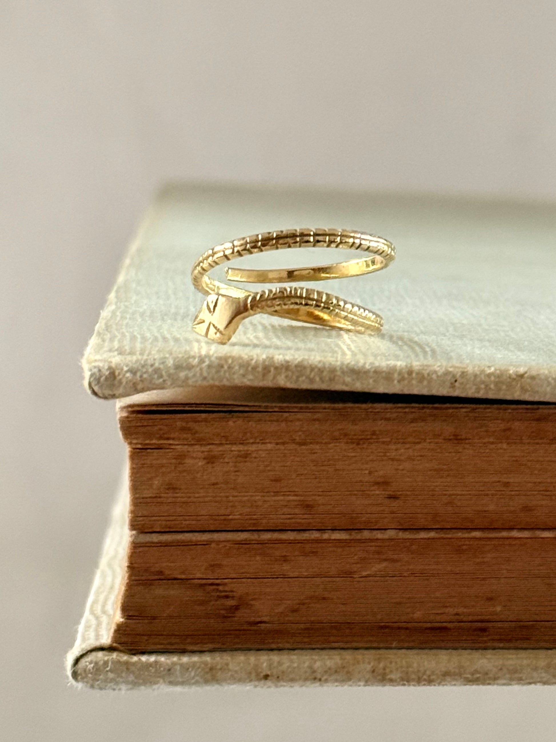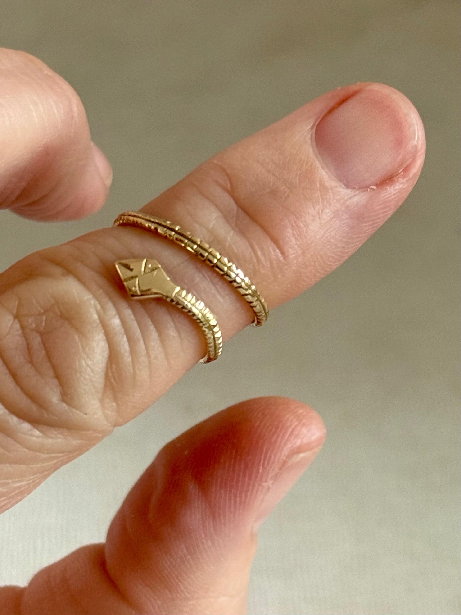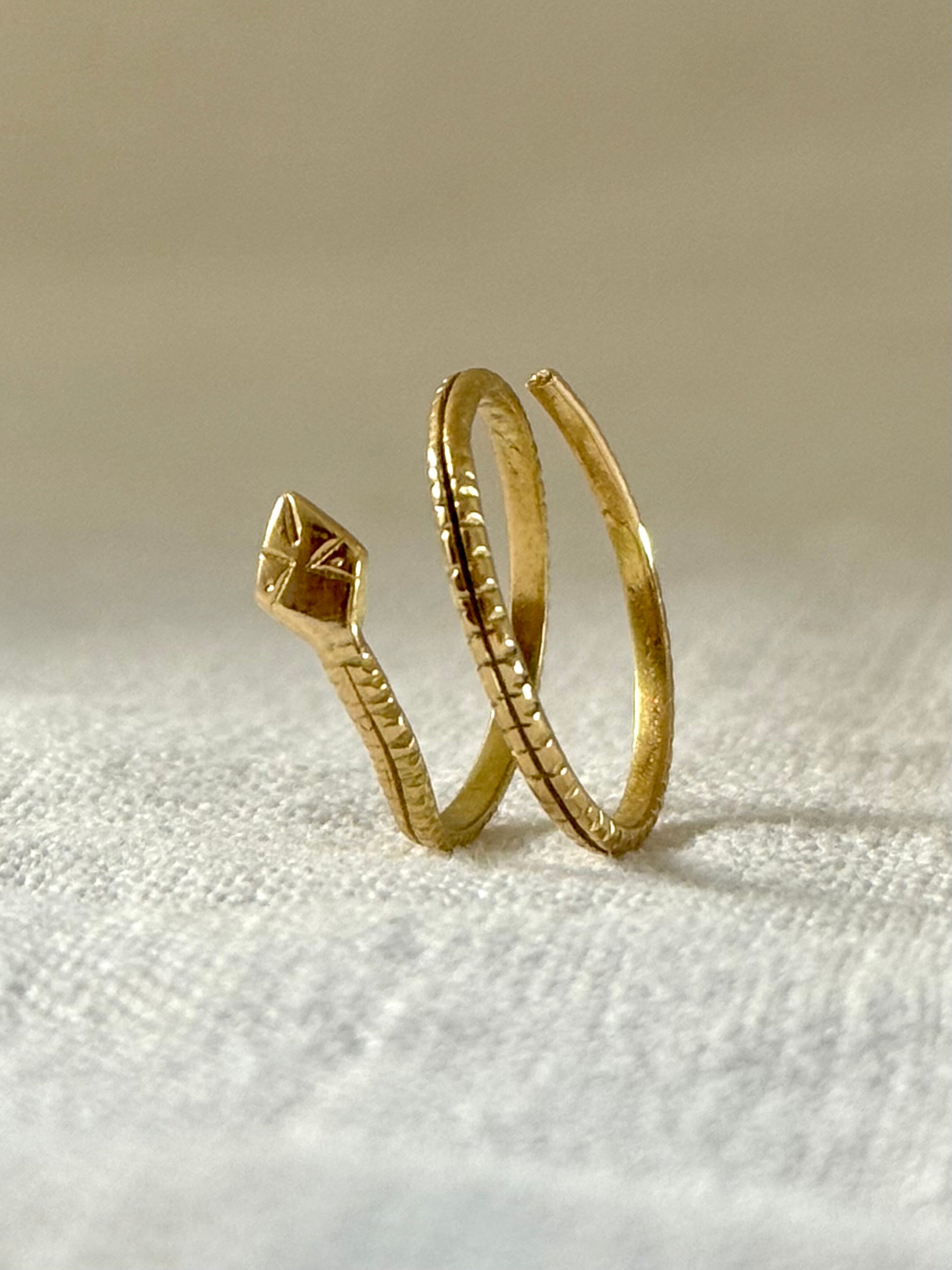 The snake ring is a long open ended coil of gold that is hand formed and hand engraved into the serpent form.