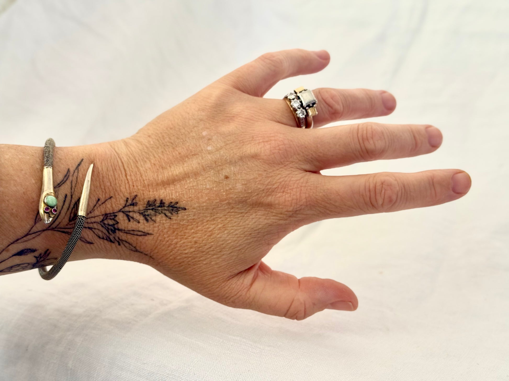 This striking Victorian revival bangle is a friendly snake head with a slightly open and happy mouth. The snake head is encrusted with a sea blue Chrysoprase cabochon head and two pink ruby eyes. The silver marked body is rich in antique patina with slight gold gilding still visible in places.