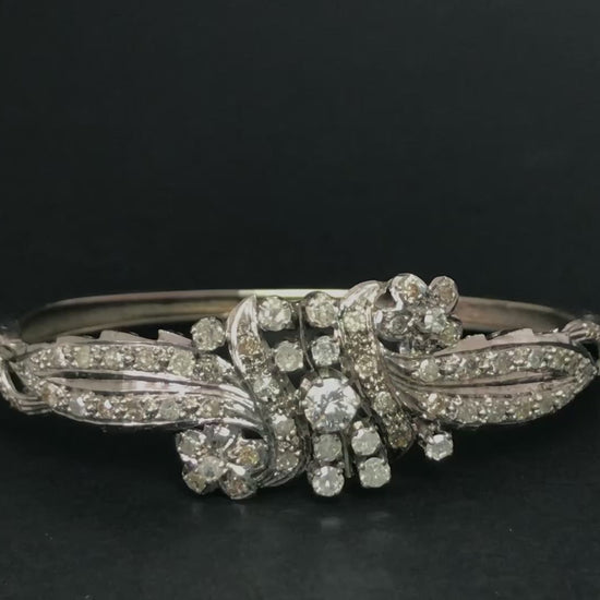 This exquisite diamond and 9ct white gold clasp bangle is all over encrusted with 63 iridescent diamonds set in a Belle Epoque styled floral and foliage white gold setting.