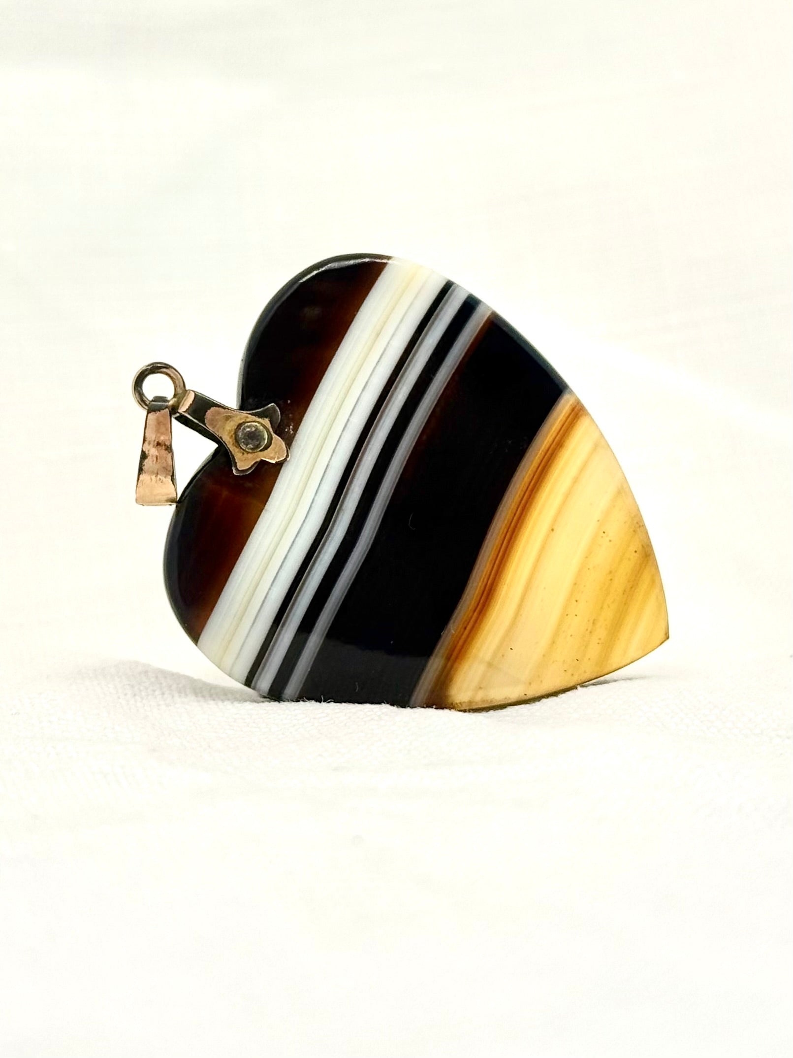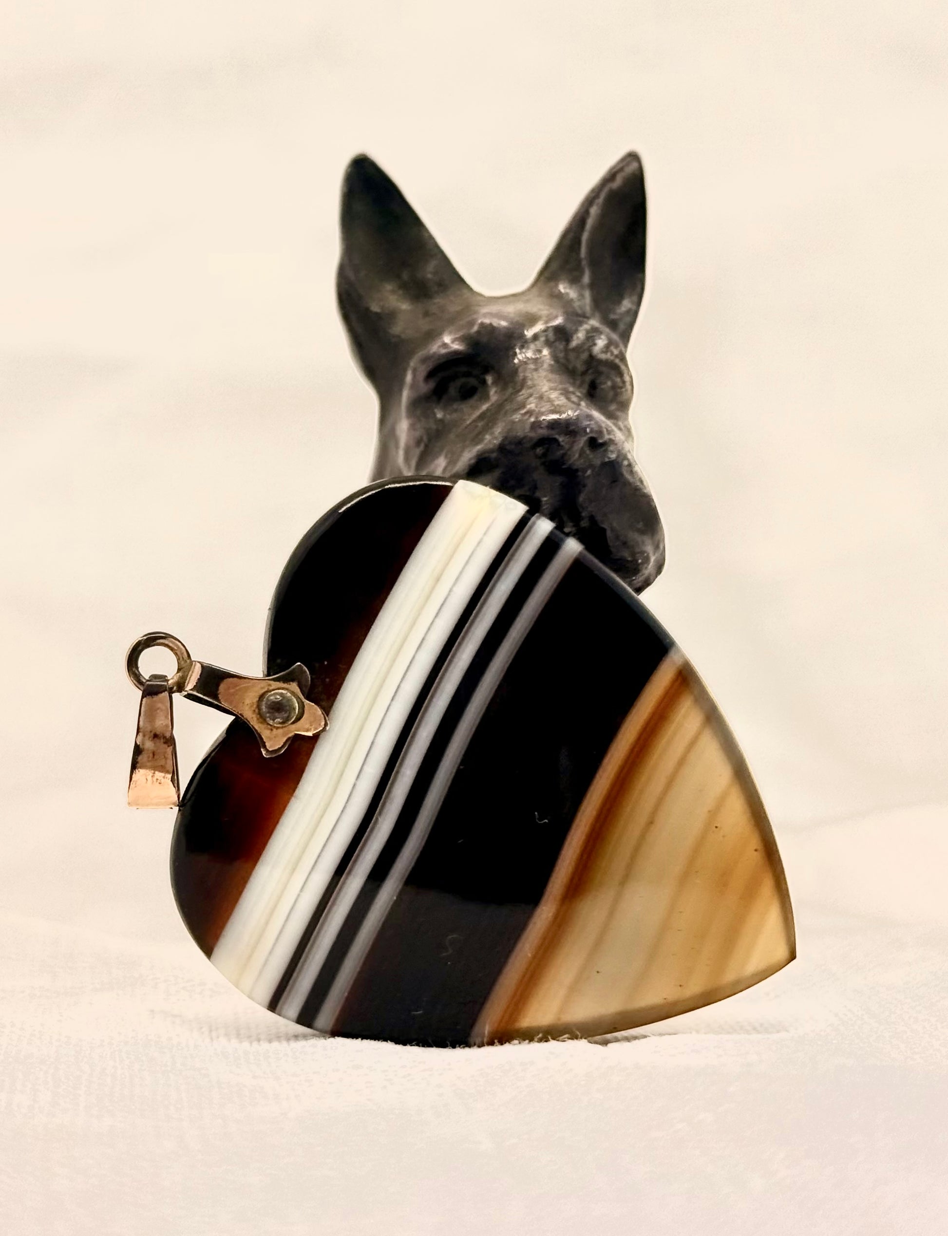 A gorgeous oversized and chunky antique hand carved banded Agate gemstone heart pendant. It’s truly lovely.