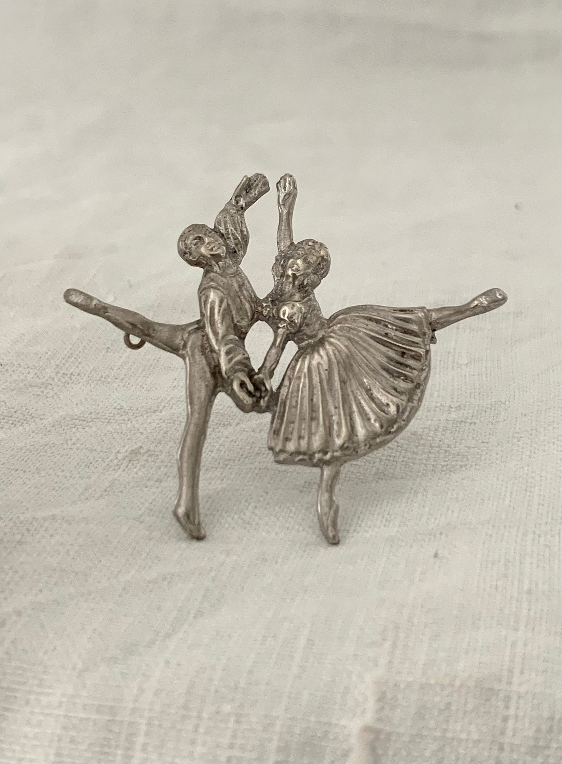 The brooch, hallmarked for Birmingham, England, 1949 holds a lady and gentleman dancing pair in mid dance.