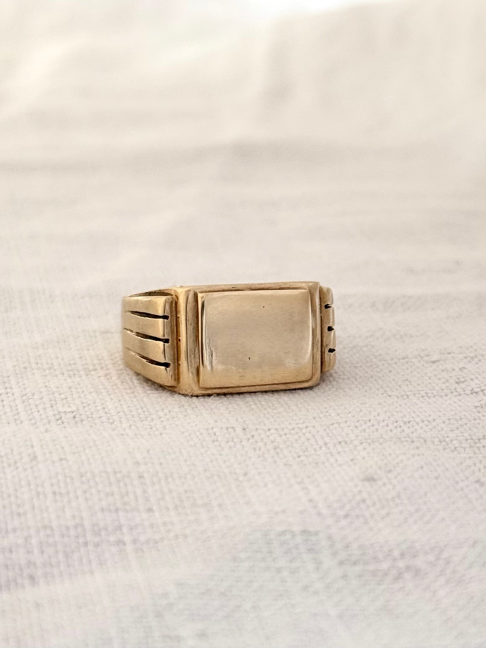The timeless and sophisticated gold signet ring features a bold rectangular face with stepped shoulders.