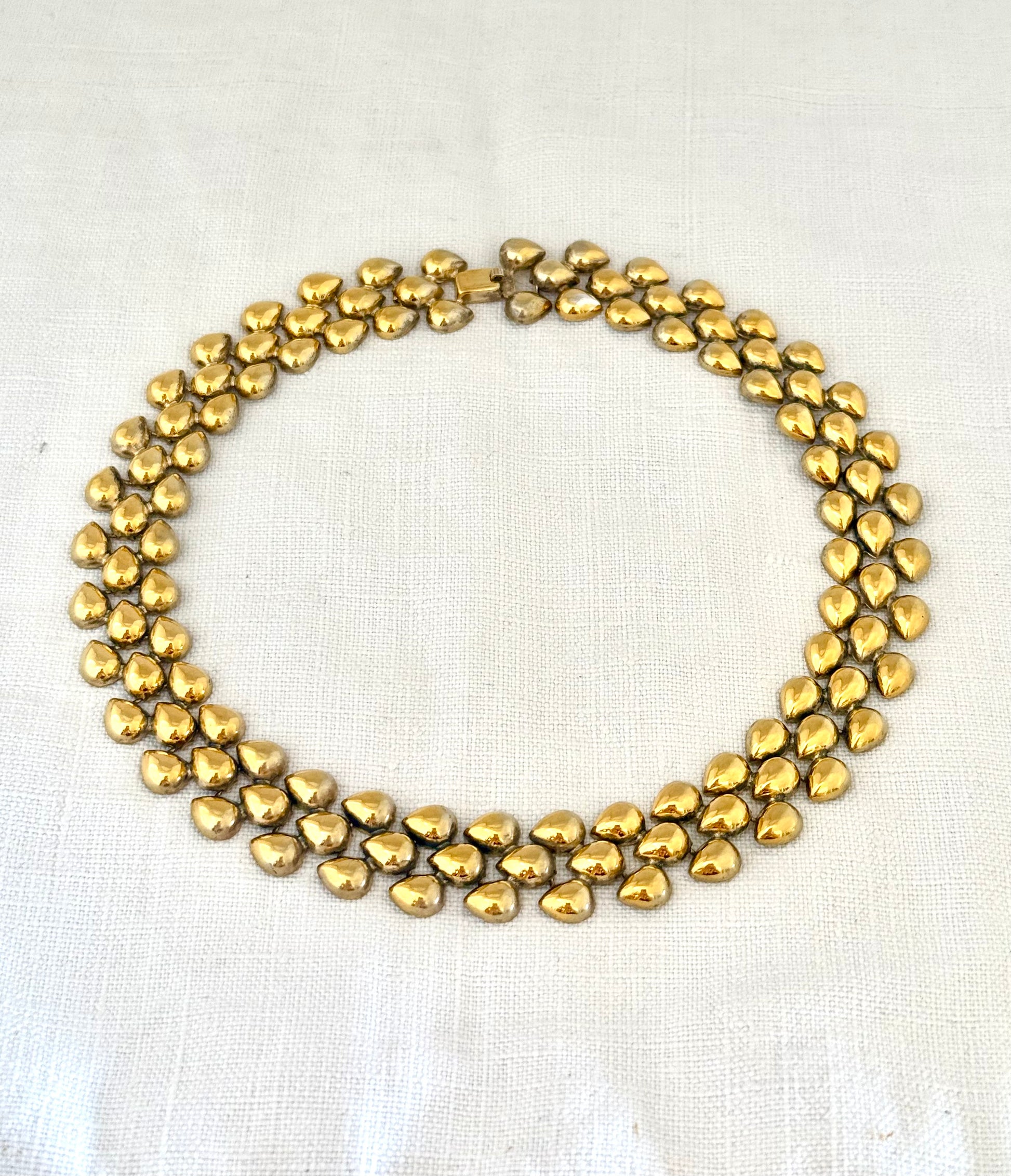 This modernist fancy form European made choker necklace is made up of small, hand formed and arched teardrop forms that sits stacked in a three form chain repetition.