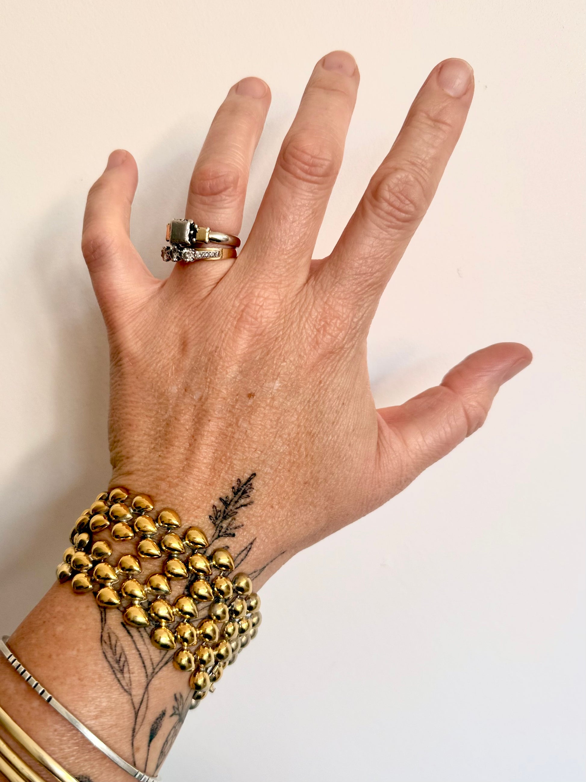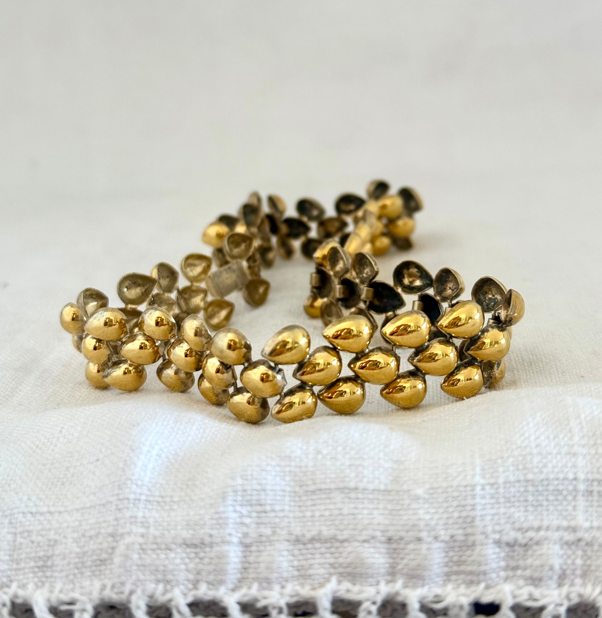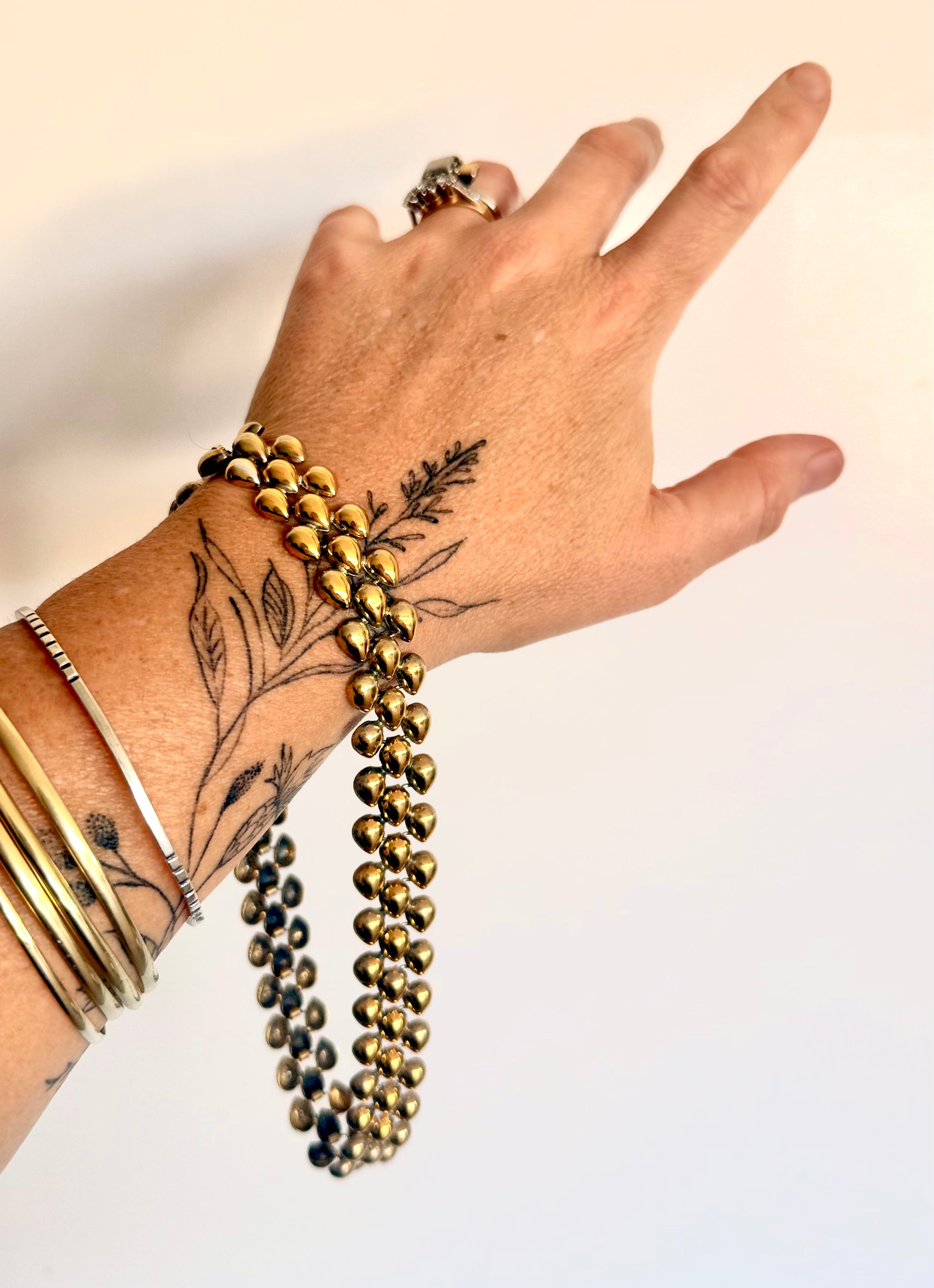 It is beautiful and, with the current length of the necklace, it can be worn as a multi link, architectural form gold form bracelet. There is slight gold plating loss near the box clasp finial.