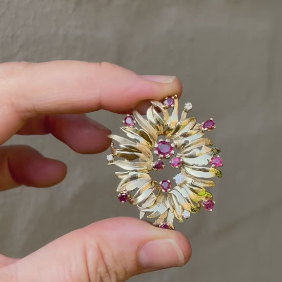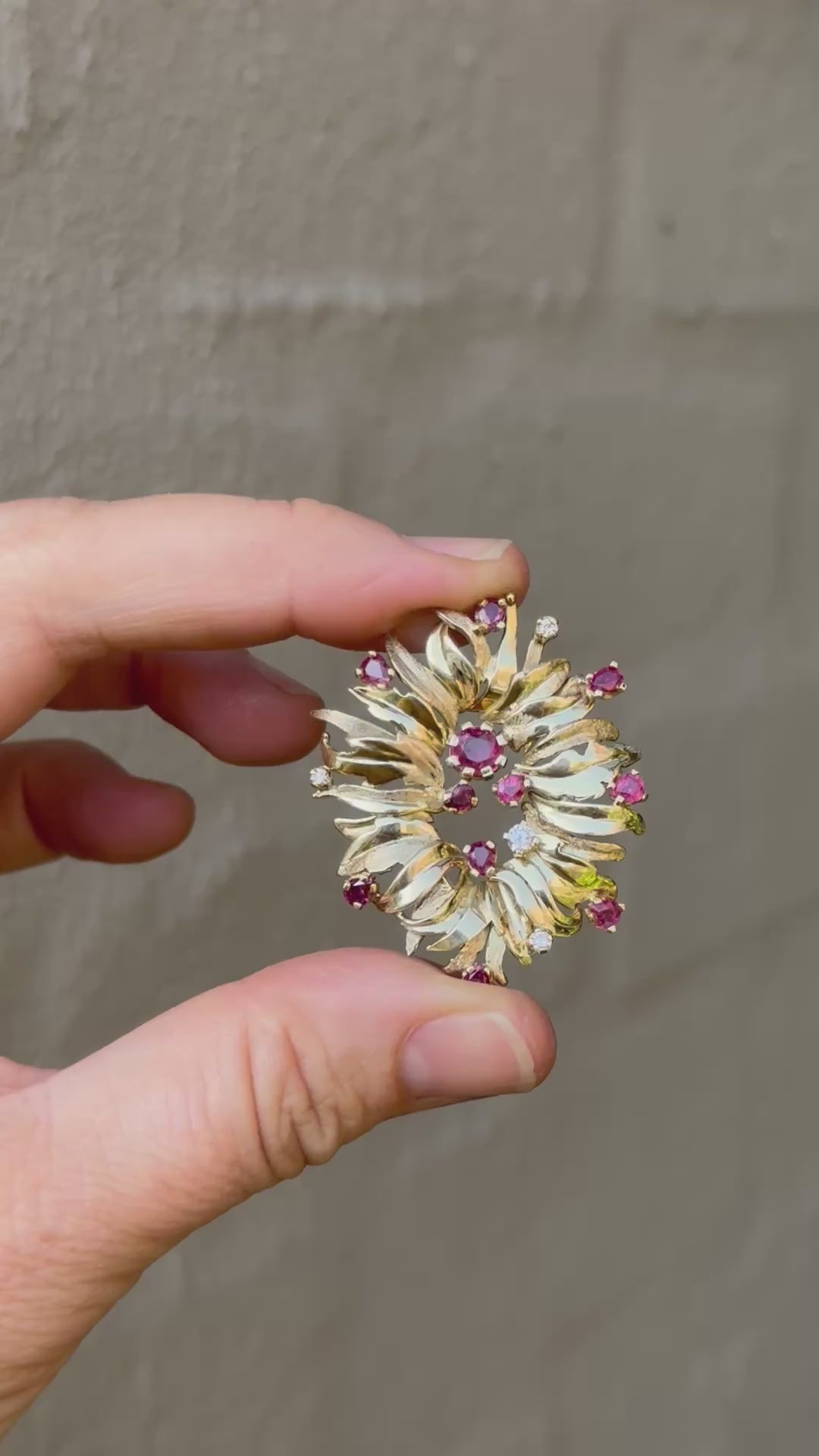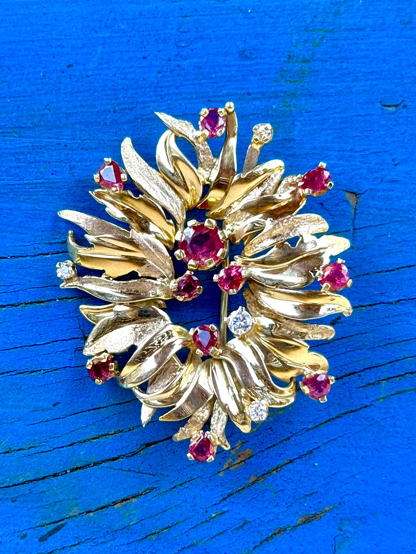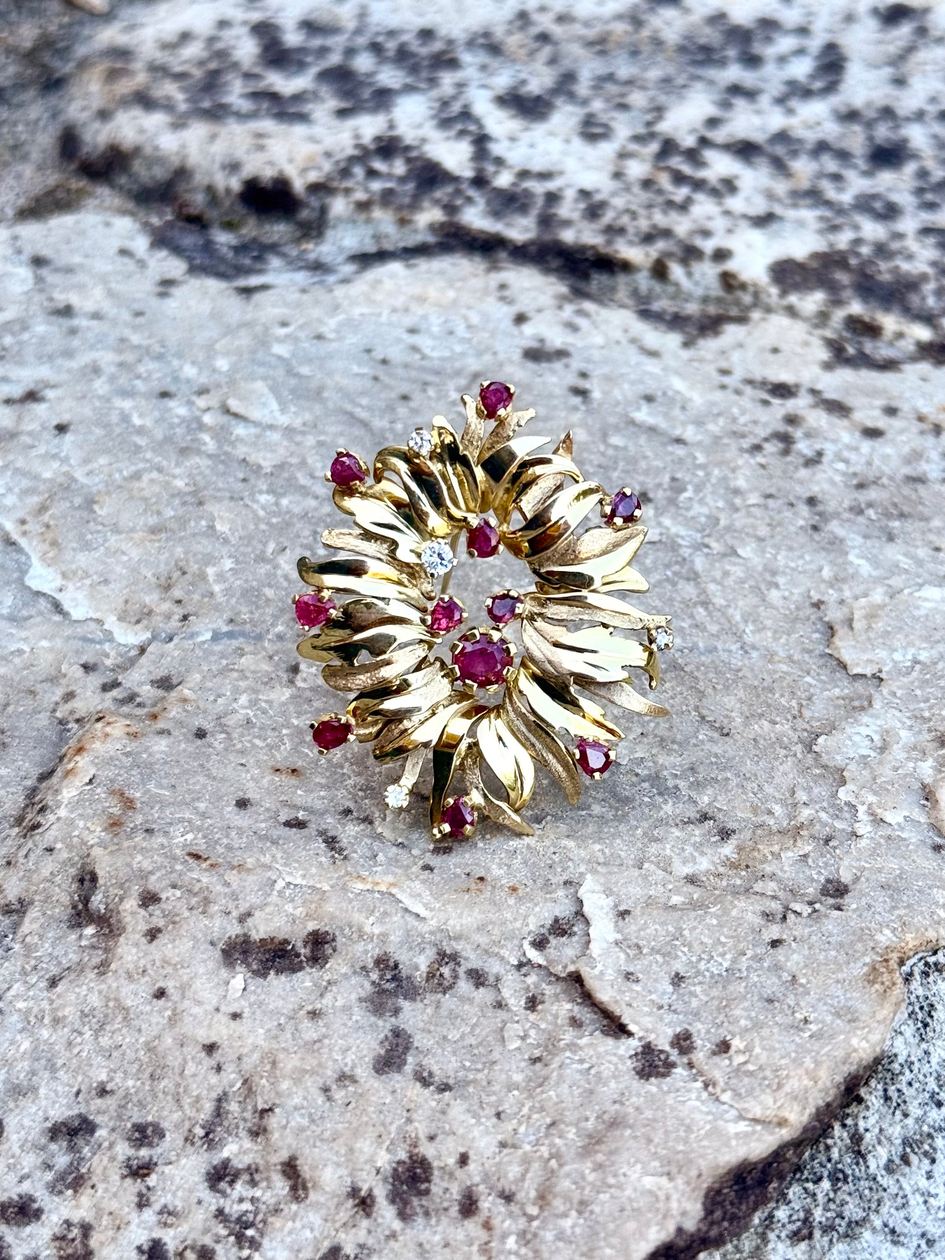 .1960s .1970s .375 gold modernist Diamond and Ruby gemstone heirloom Edelweiss flower spray brooch pin